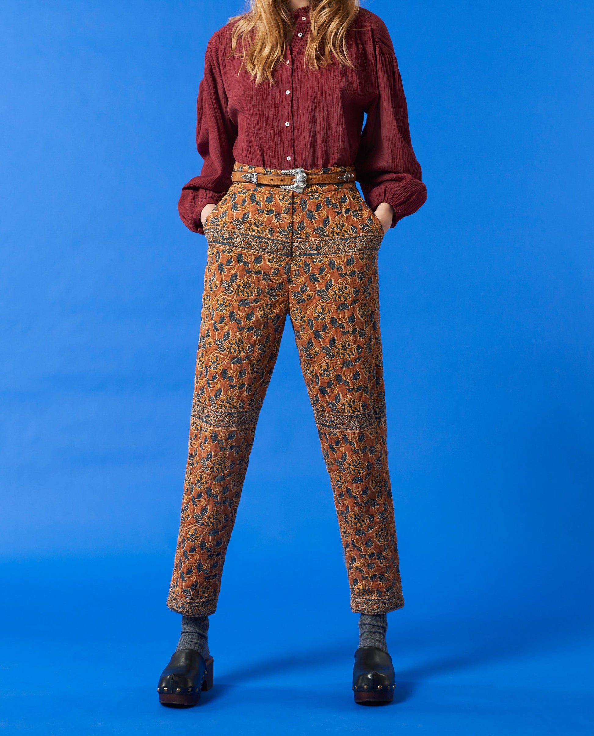 Pantalon matelassé effet boutis en coton jacquard. Impressions florales au batik. Taille haute. Coupe droite. Deux poches latérales. Bouton en nacre véritable. Doublure intérieure a imprimé contrasté. 100% Coton