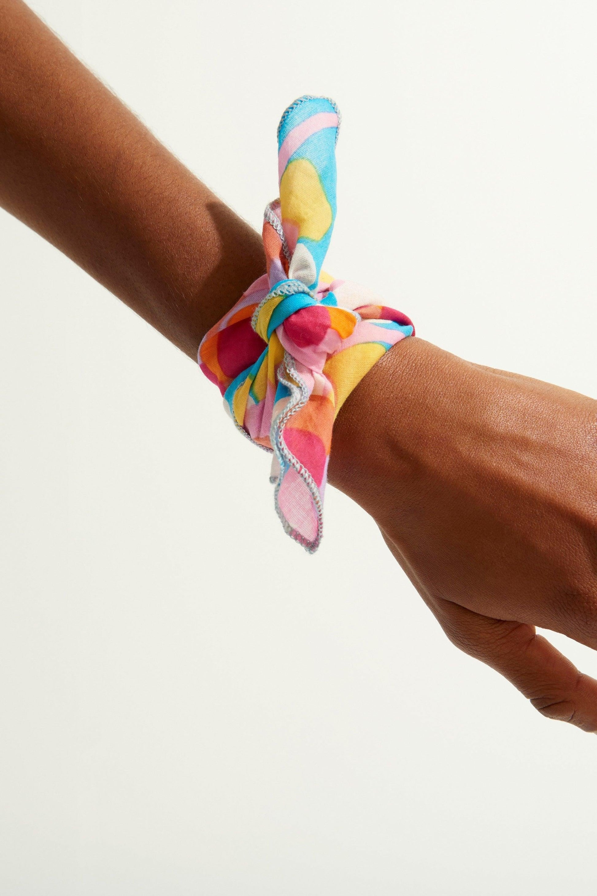 Blue, yellow, pink and cream-coloured floral print bandana. Can be worn around the neck, wrist, or to accessorize a bag. 100% cotton