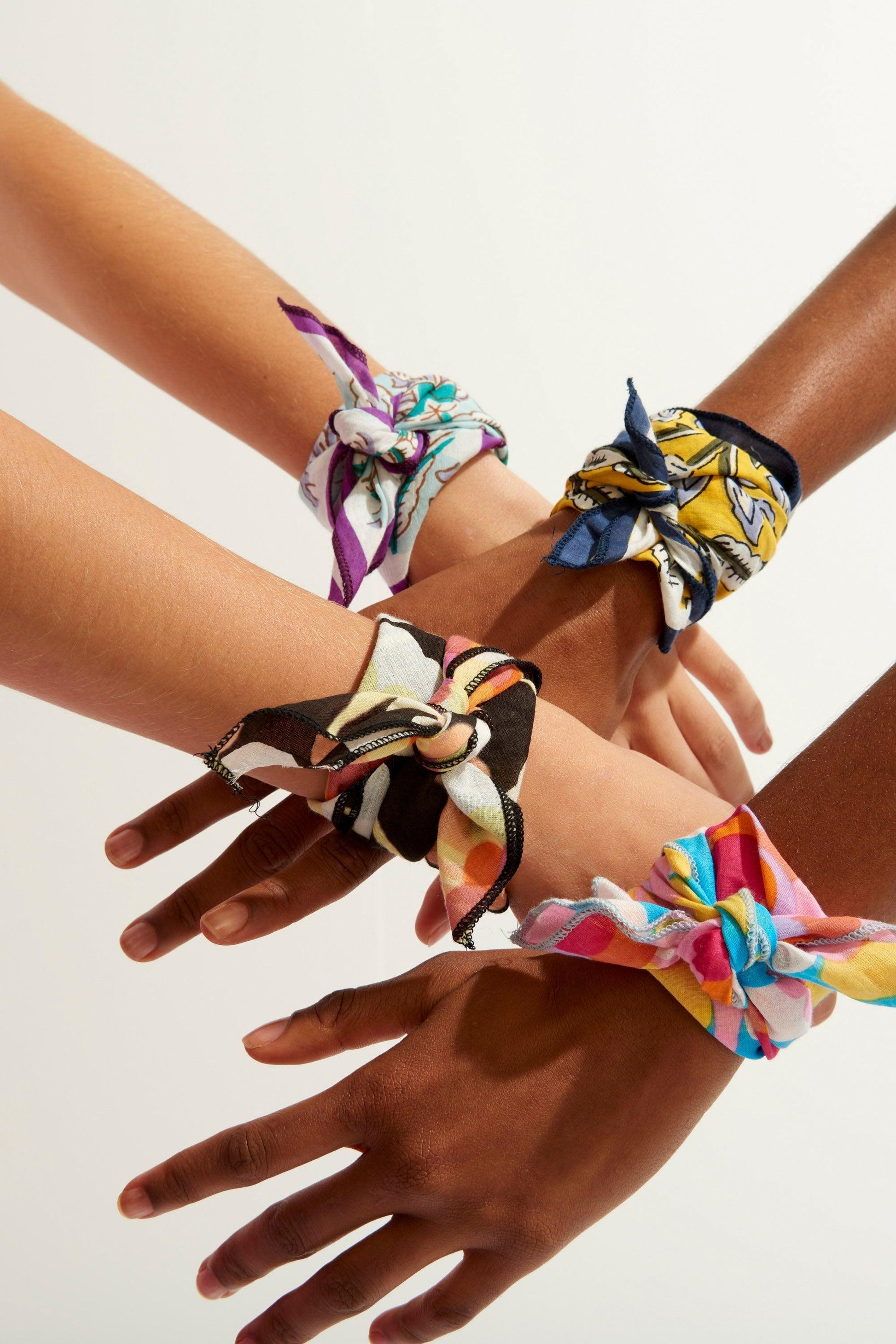Brown, yellow and cream-coloured floral print bandana. Can be worn around the neck, wrist, or to accessorize a bag. 100% cotton