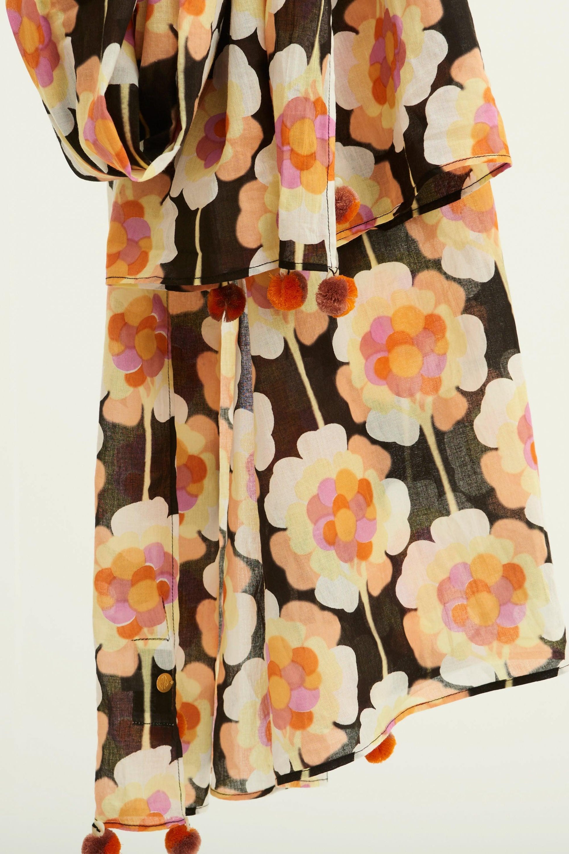 Floral print cotton veil pareo in brown, yellow and cream tones. Small pompom on the tips of the pareo. This generous pareo can be worn around the waist for a perfect beach style, or tied around the neck for cool summer evenings. 100% cotton