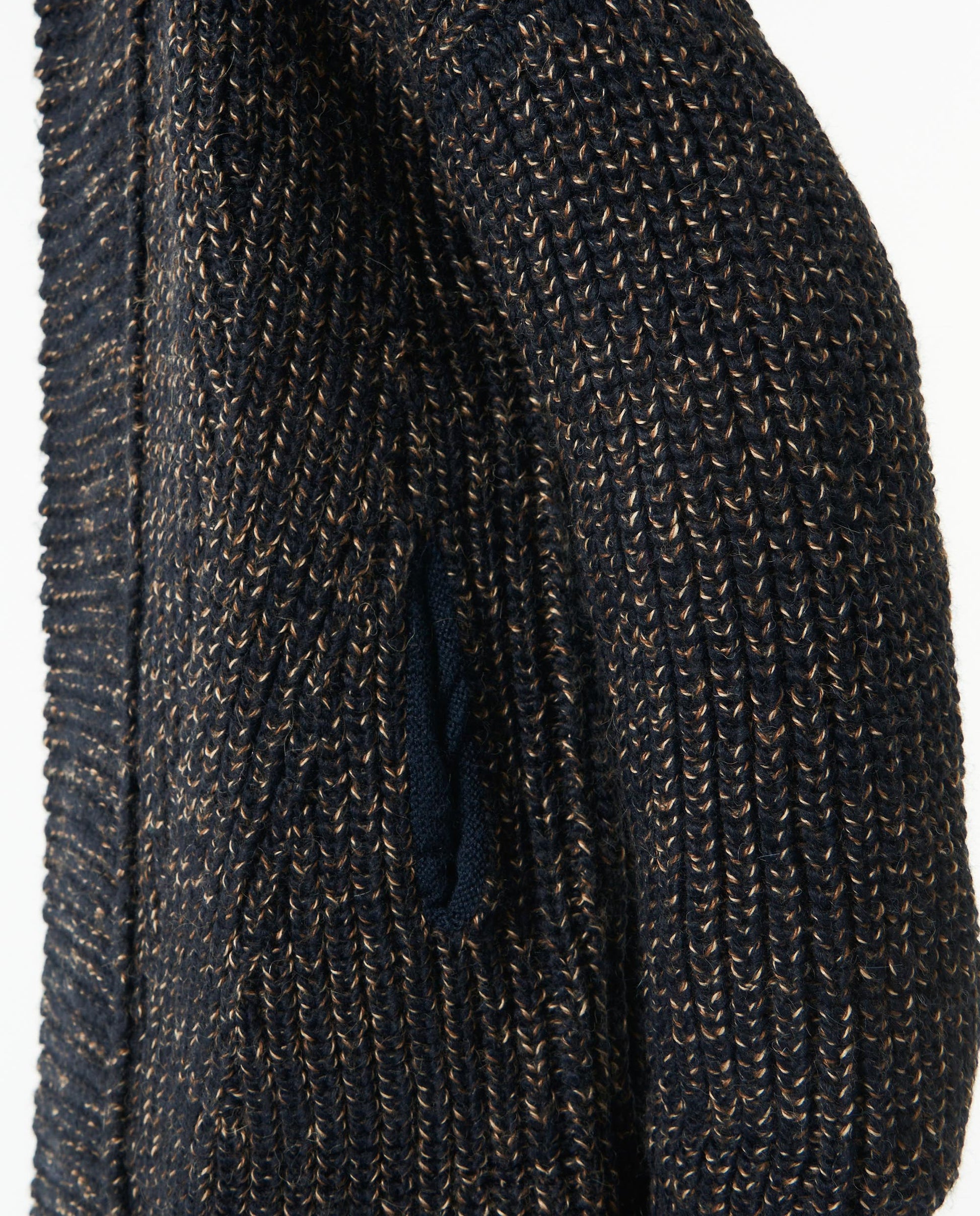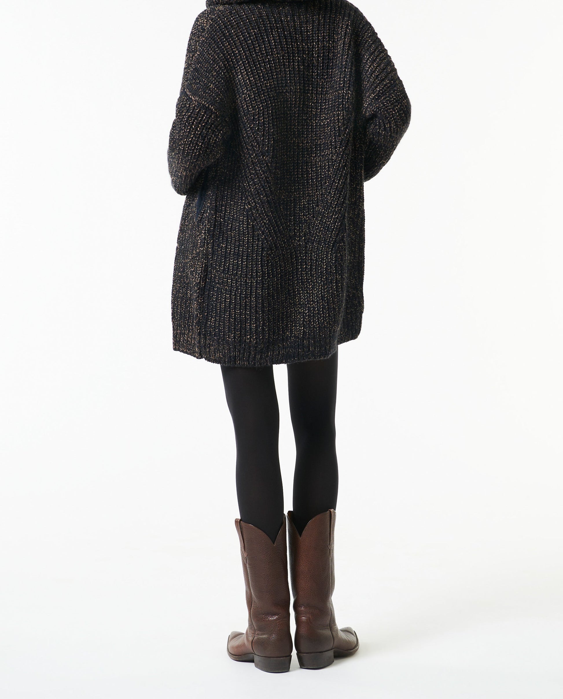 Gilet long style petit manteau en maille d'alpaga mélangée. Deux grandes poches côté. Fils épais en maille chinée.