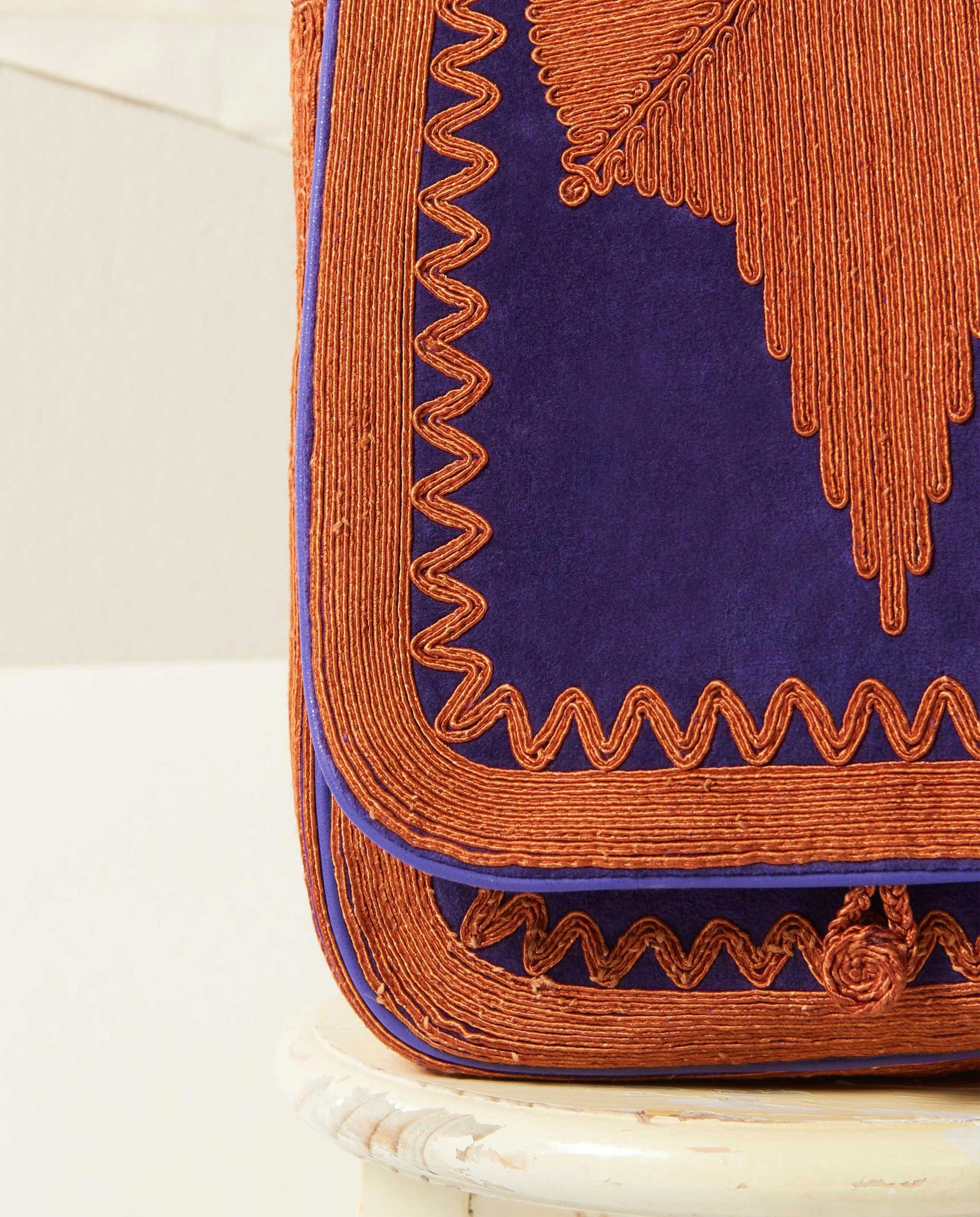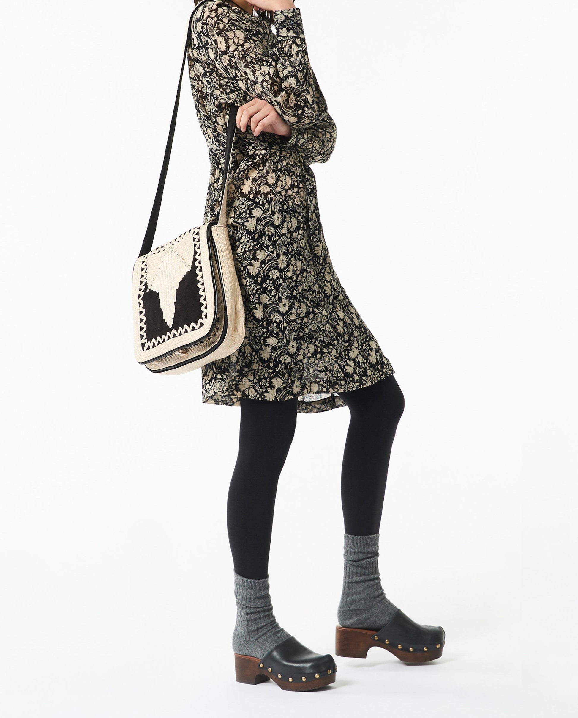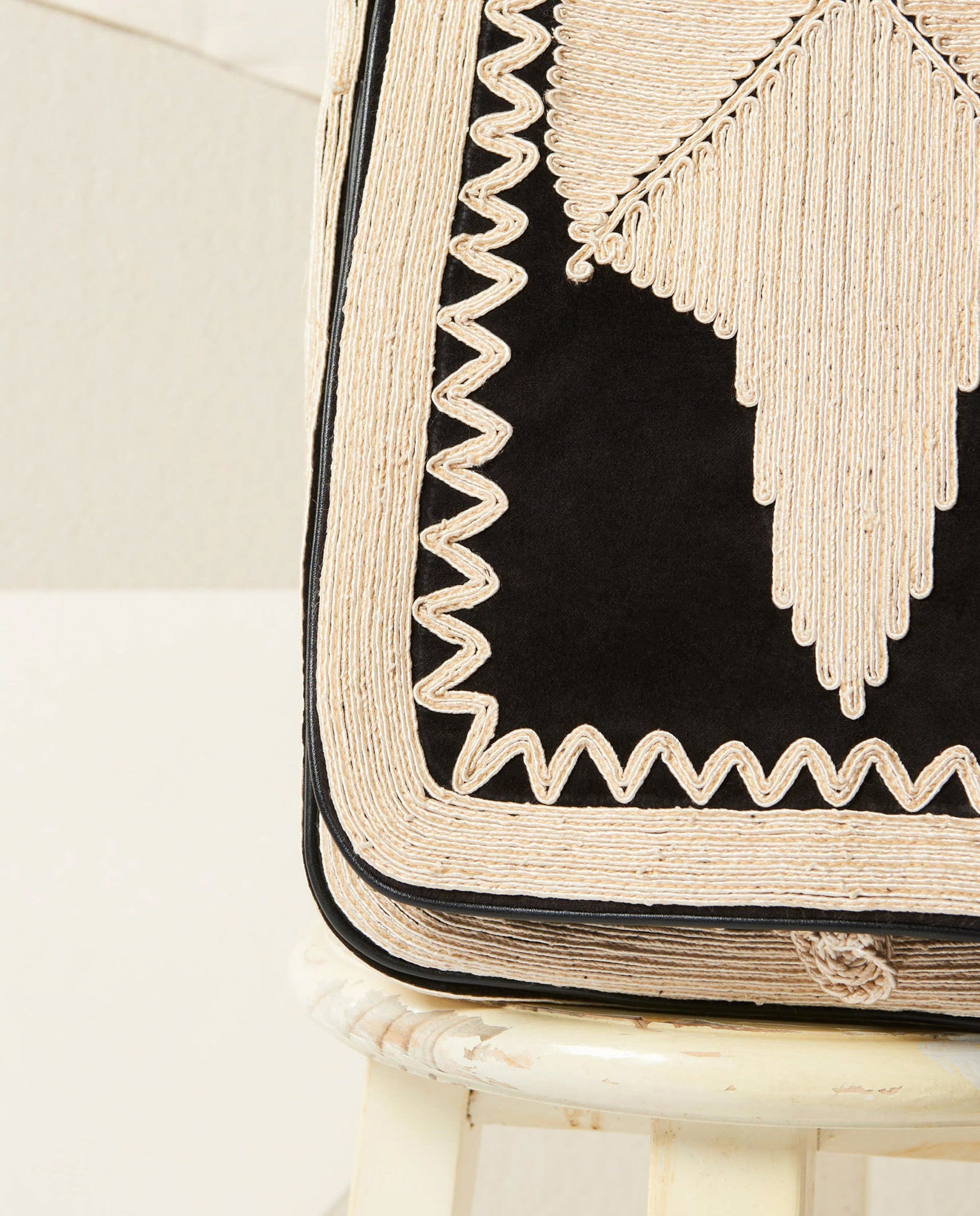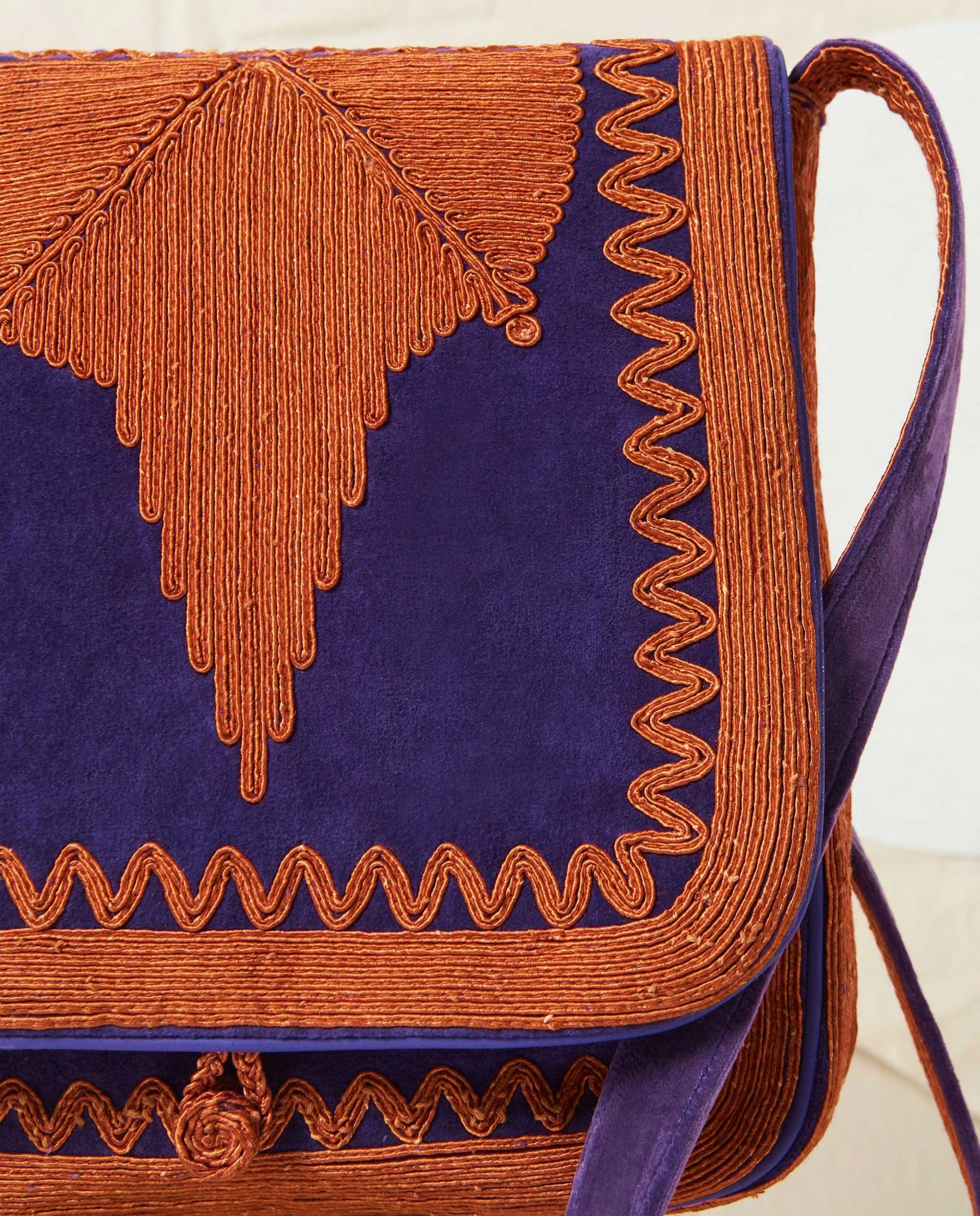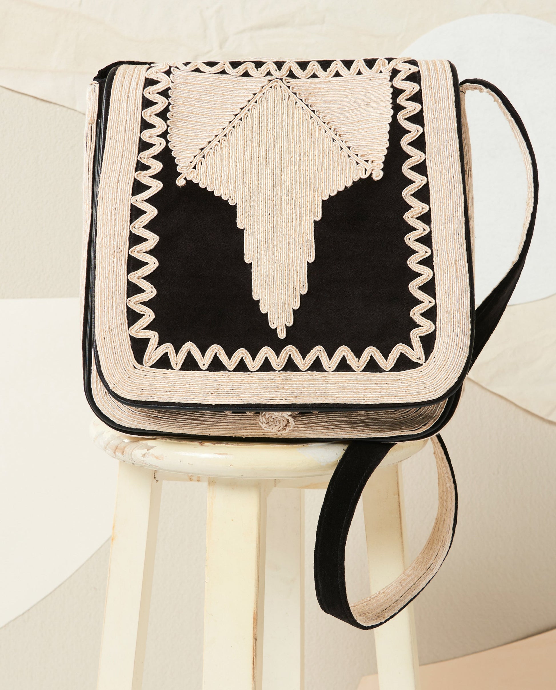 Besace à porter en bandoulière. Broderies crème en viscose réalisées à la main. Fermeture à bouton brodé passant. Pochette intérieure zippée. Extérieur : 100% Coton velours Doublure : 100% Coton
