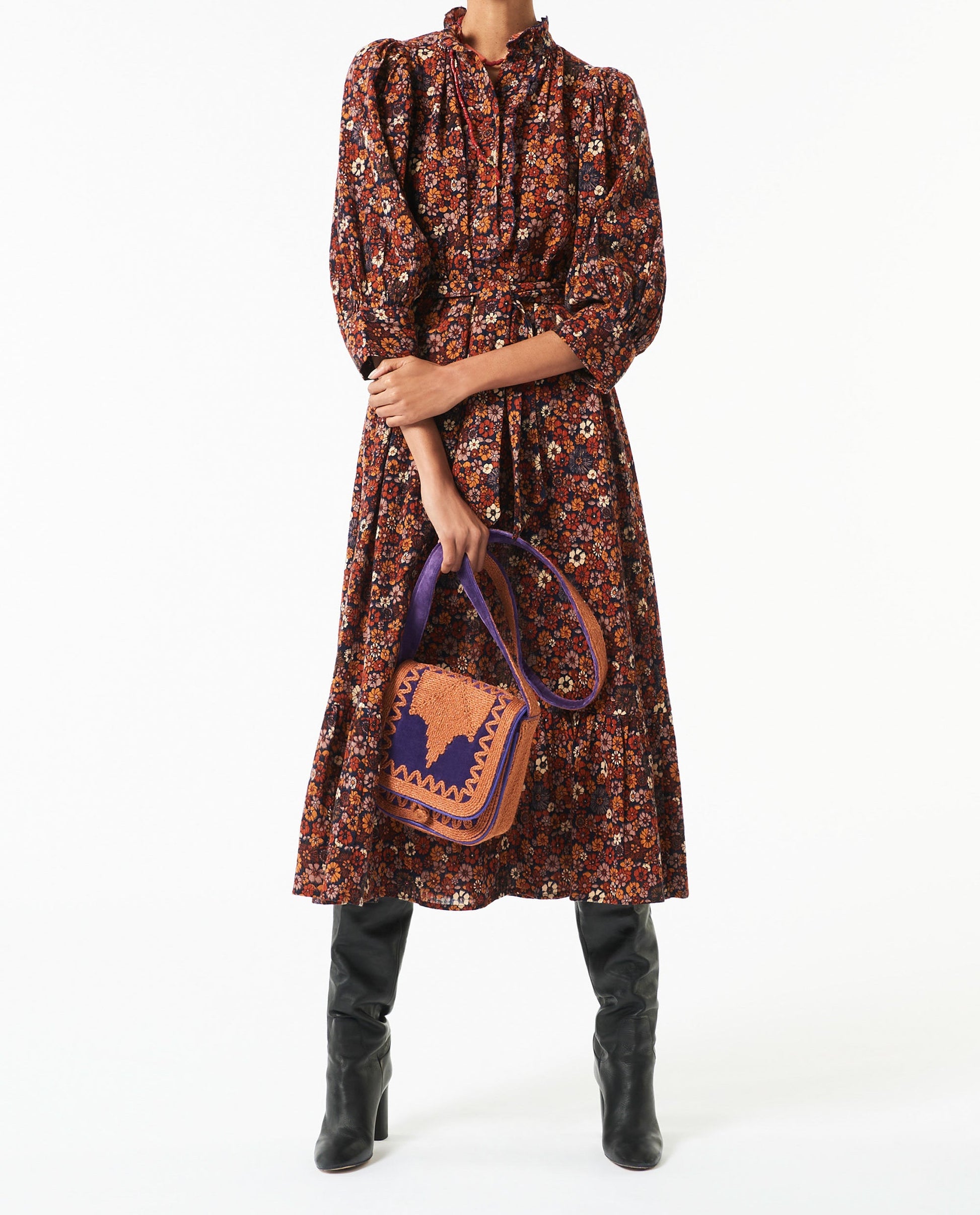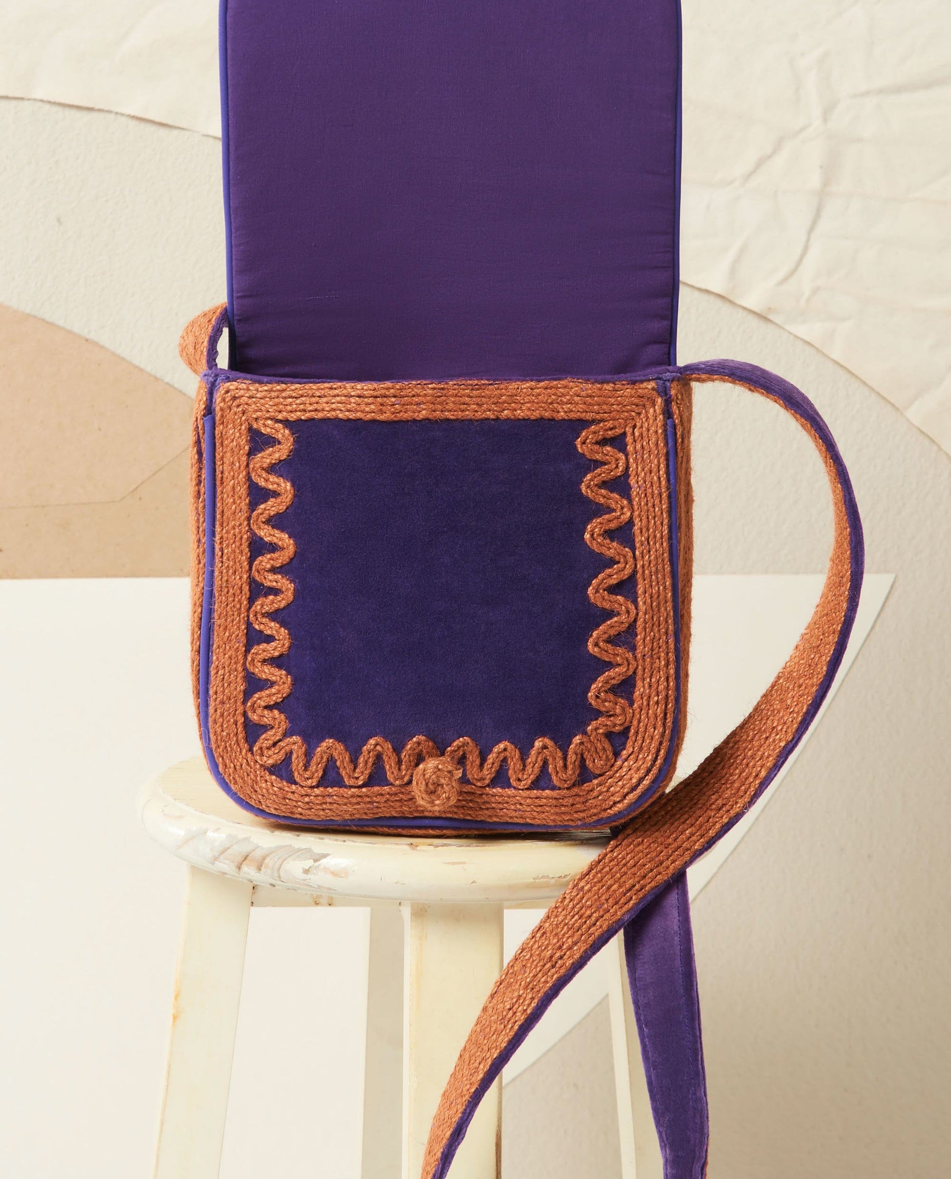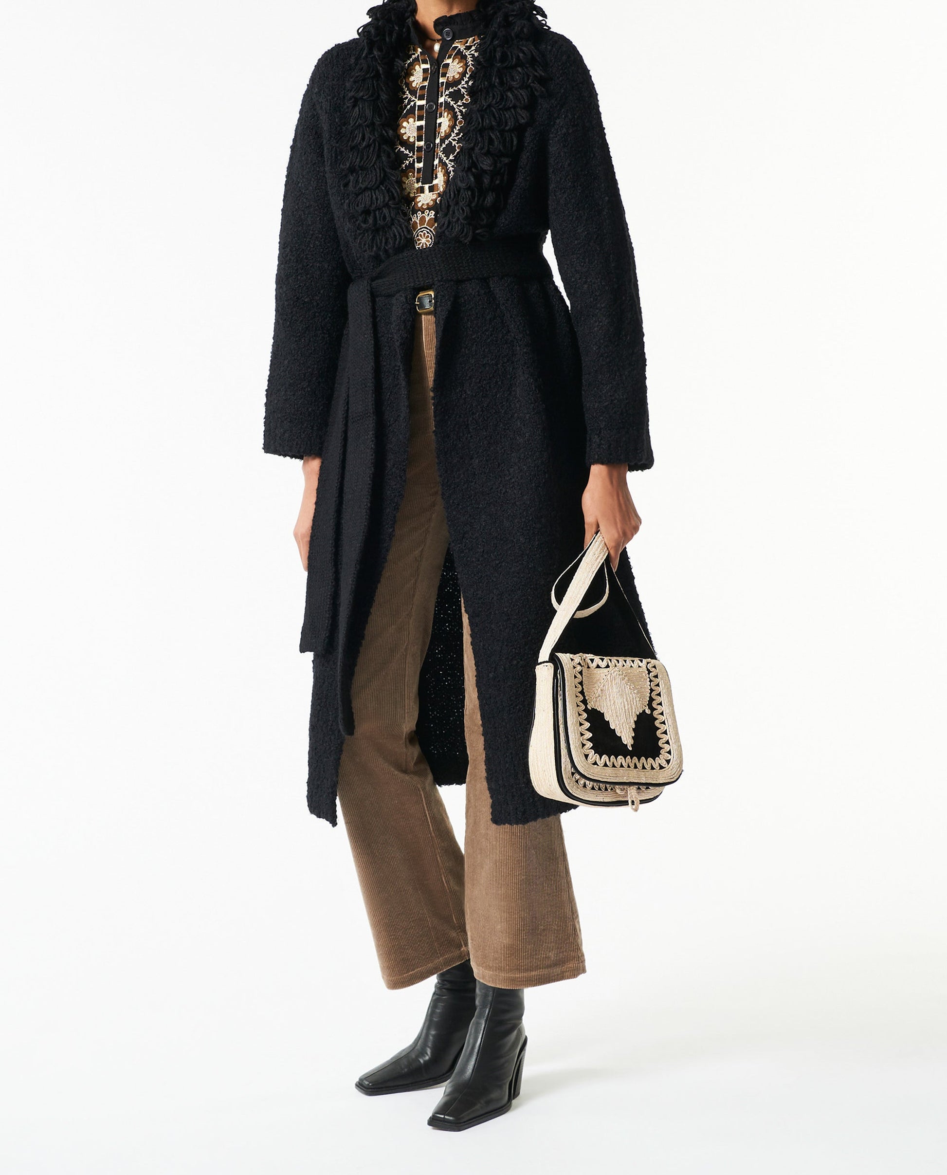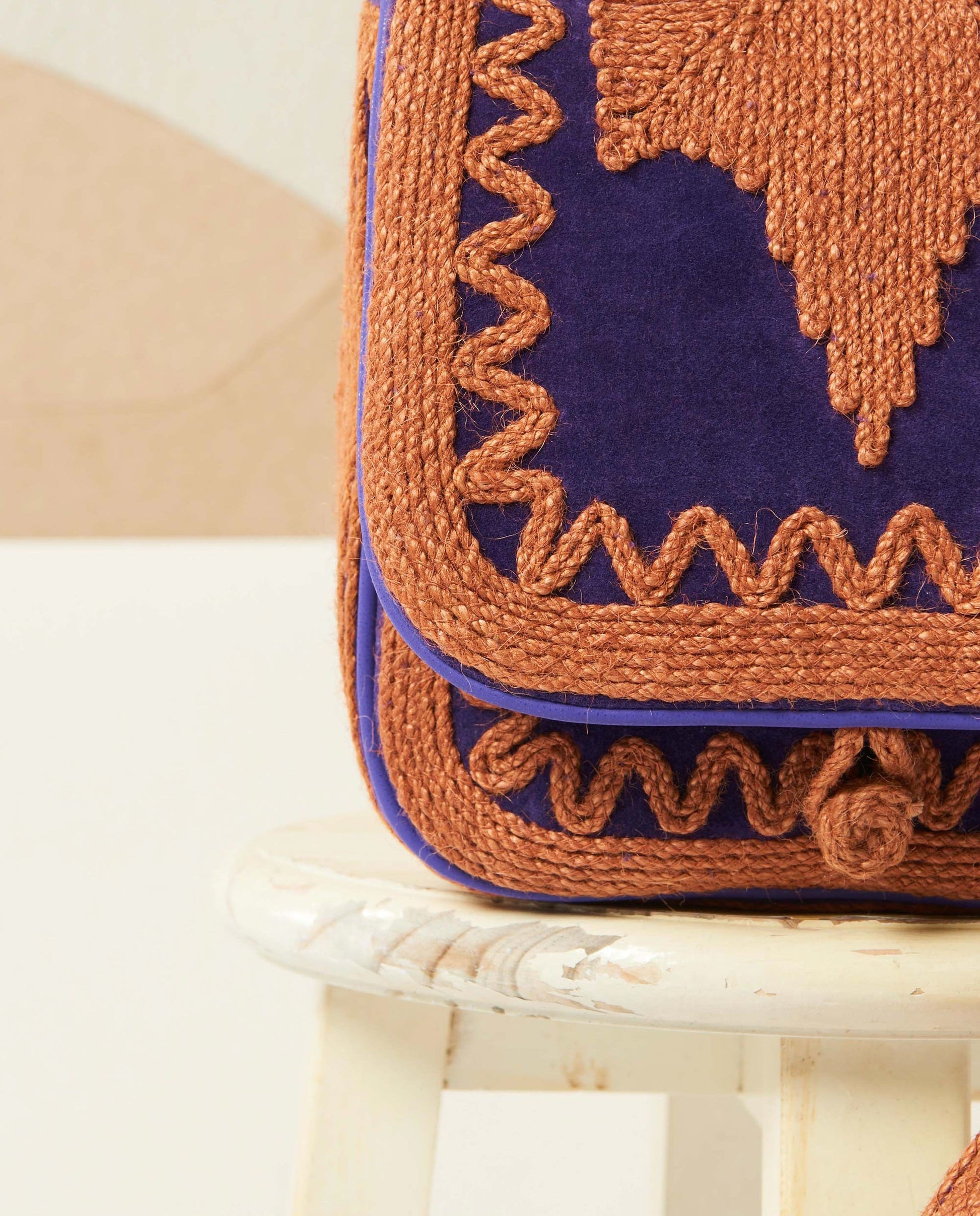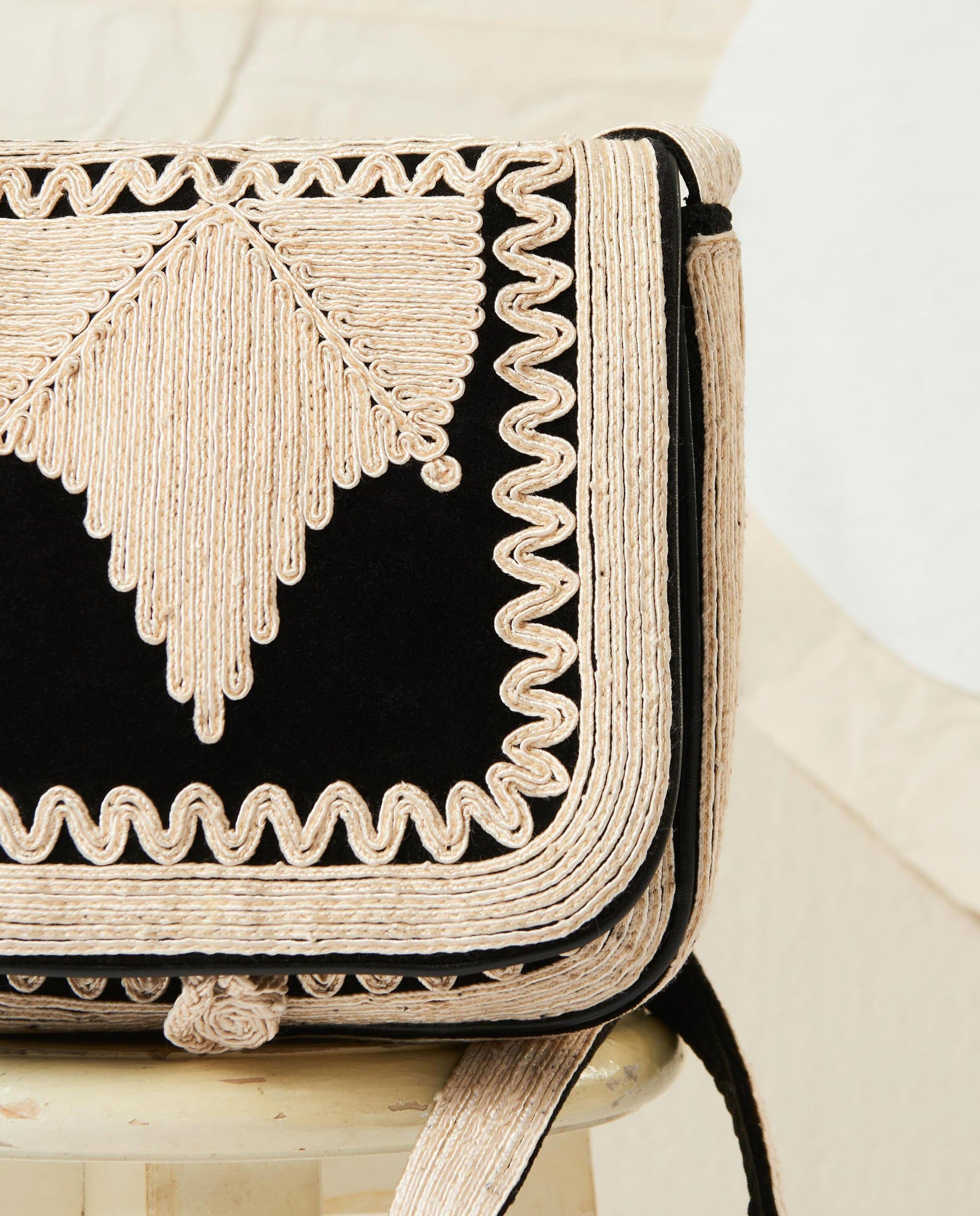 Petite besace à porter en bandoulière. Broderies crème en viscose réalisées à la main. Fermeture à bouton brodé passant. Pochette intérieure zippée.
