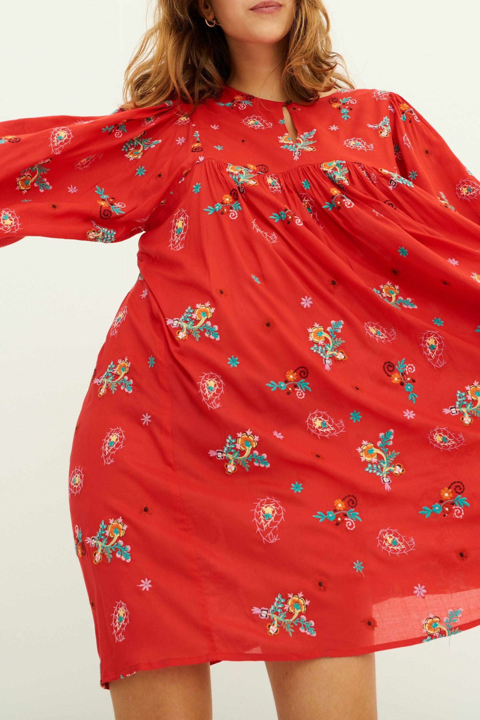 Flowing red mini dress with multicolored floral embroidery. 3/4-length puff sleeves. Round neck with small button closure. Pleats at the chest. This lightweight, flowing dress is ideal for sunny spring days. Fully lined. 100% viscose