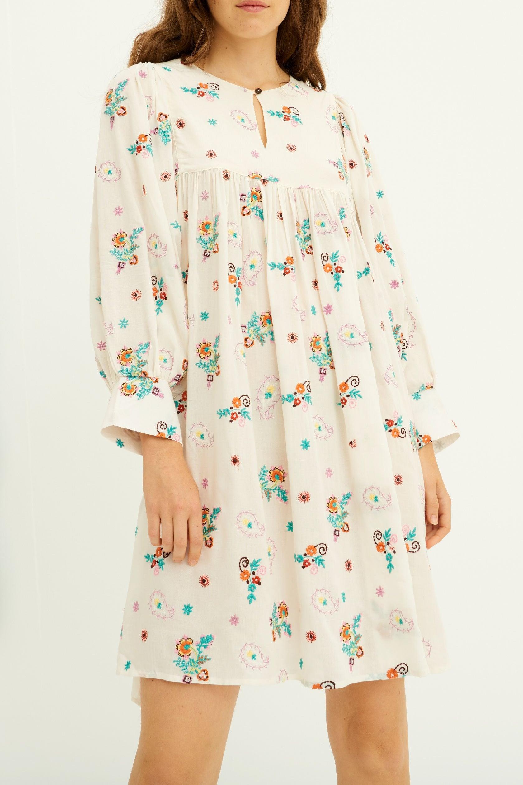 Flowing white mini dress. All-over multicoloured floral embroidery. 3/4-length puff sleeves. Round neck with small button closure. Pleats at the chest. This lightweight, flowing dress is ideal for sunny spring days. Fully lined. 100% viscose