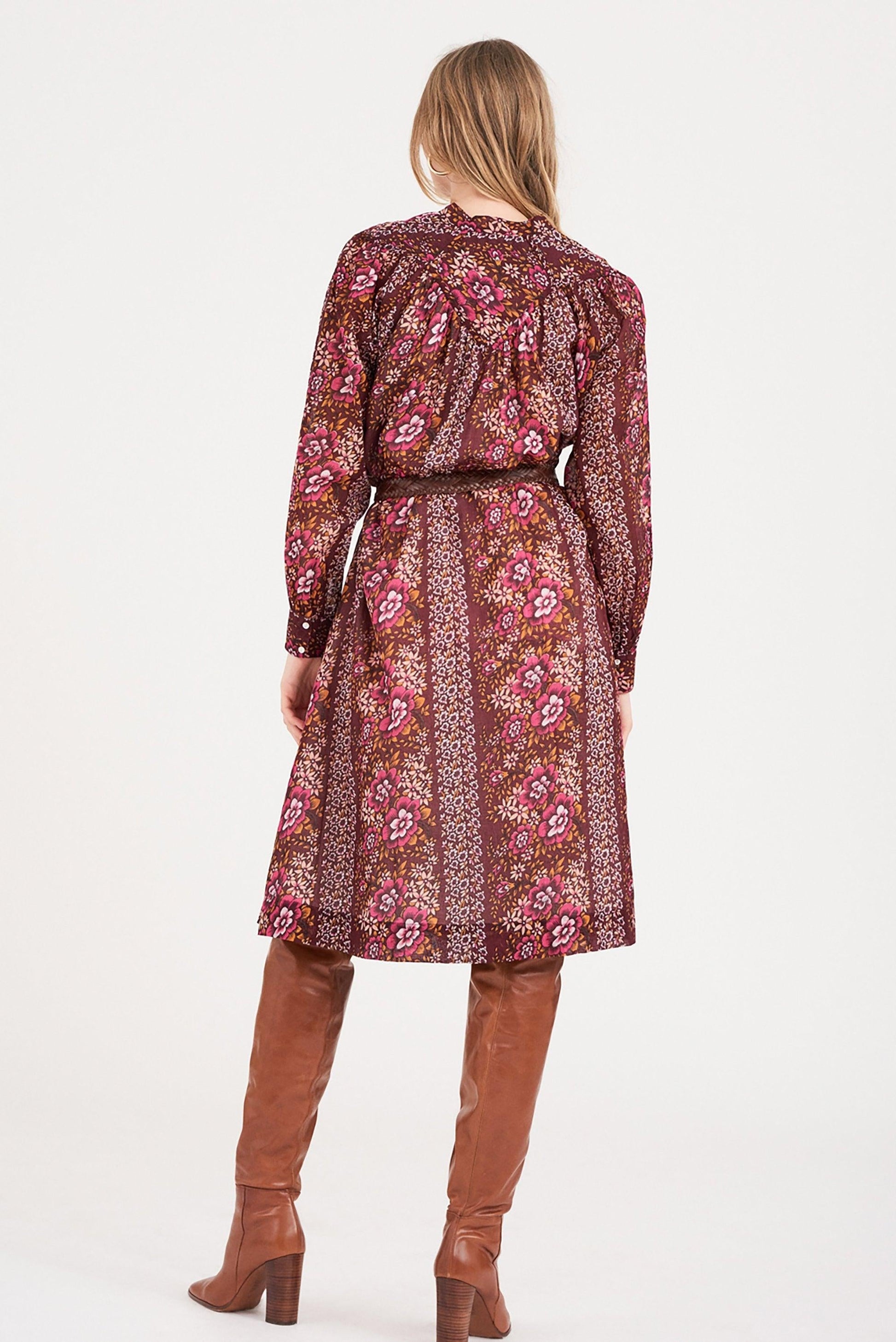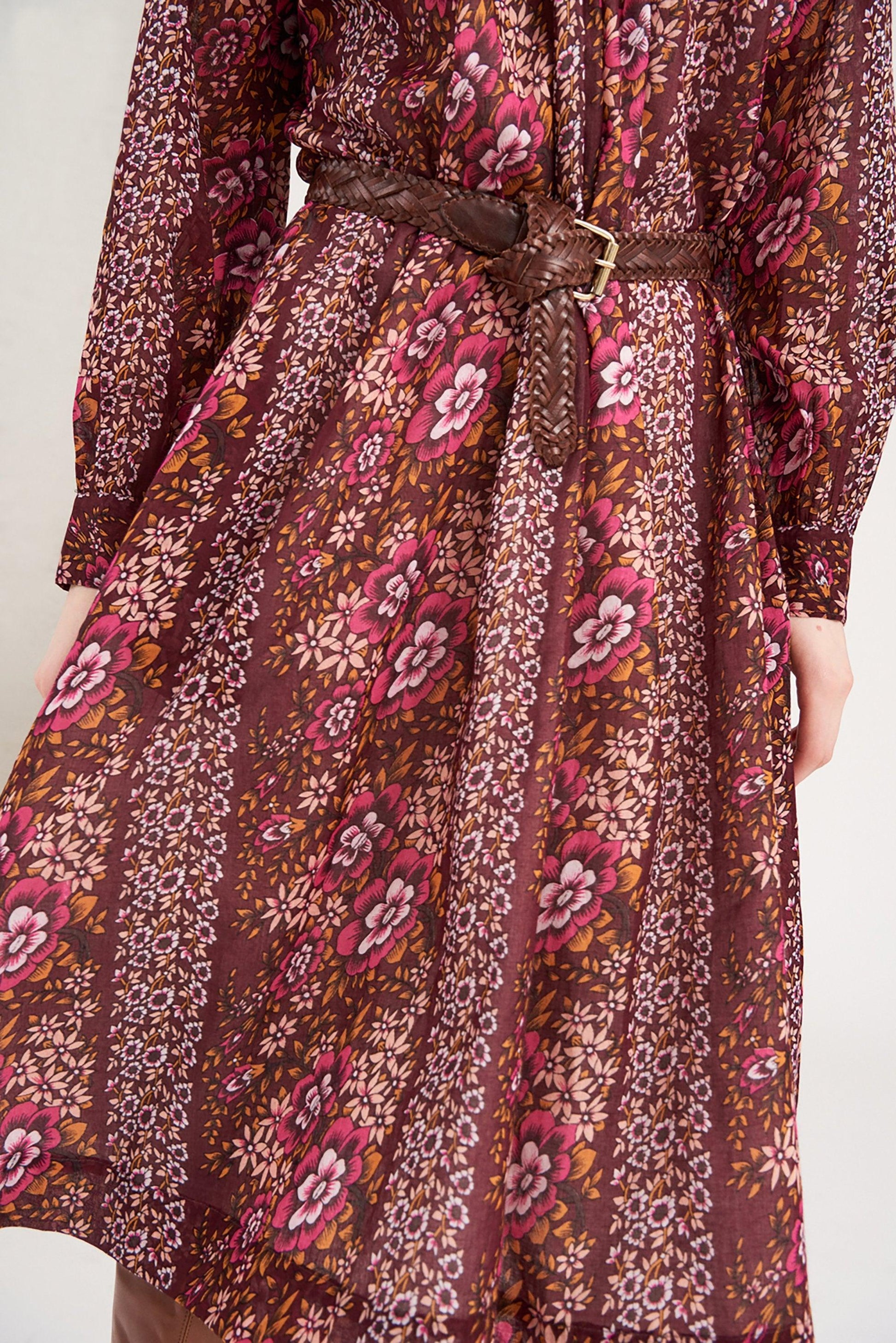 Cotton midi-dress with floral prints in pink and burgundy tones. Round collar with slightly quilted triangular neckline. All-over silver lurex stripes. Cuffs and button placket adorned with natural mother-of-pearl buttons. Go for a boho-chic dress that combines daring floral prints with a classic fit.
