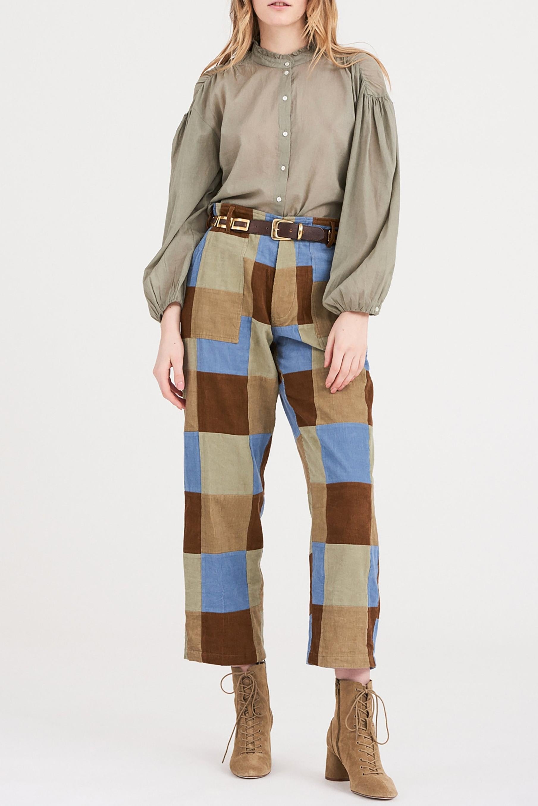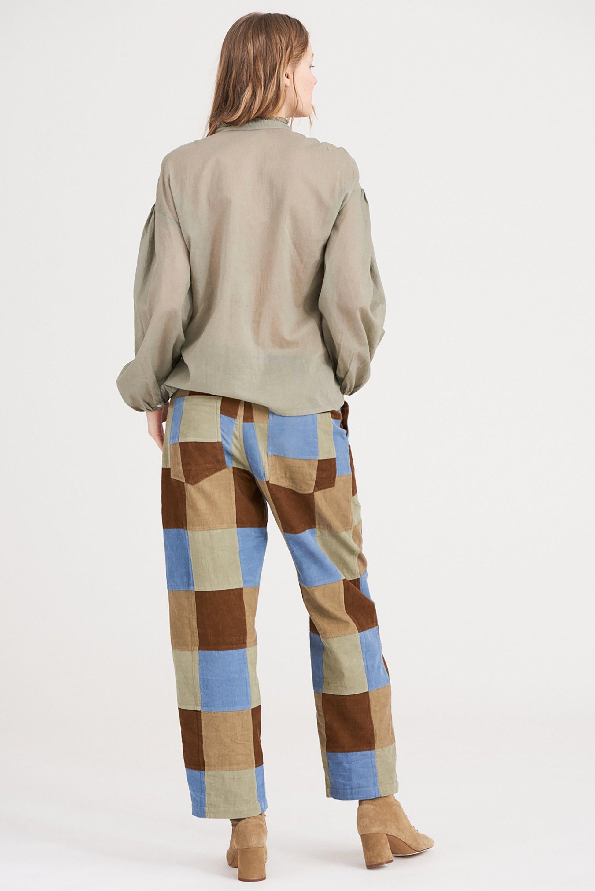 Blouse en voile de coton vert. Col rond volanté. Manches longues bouffantes resserrées aux poignets par un bouton. Plis décoratifs sur les épaules. Fermeture à boutons en nacre naturelle sur le devant. Se décline également en bleu ciel, noir, violet, ocre et crème. Cette jolie blouse se distingue par sa simplicité, elle se portera facilement avec des pièces fortes à imprimés.100% Coton