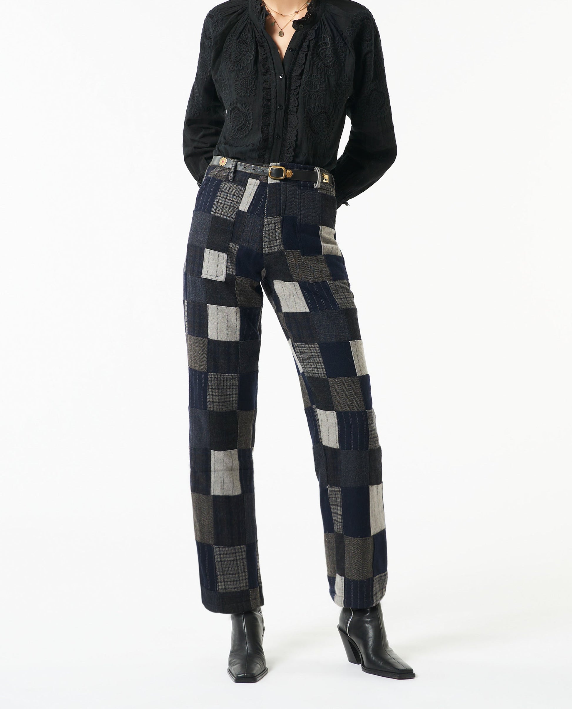 Pantalon taille haute en patchwork dans des tons gris et bleu marine. Fermeture éclair sur le devant. Coupe droite. Deux poches plaquées à l'avant. Chaque pantalon Lami est unique et fait à la main, la couleur des patchworks peut donc différer de la photo présentée sur l'eshop. 50% Laine 50% Acrylique Doublure : 100% Coton