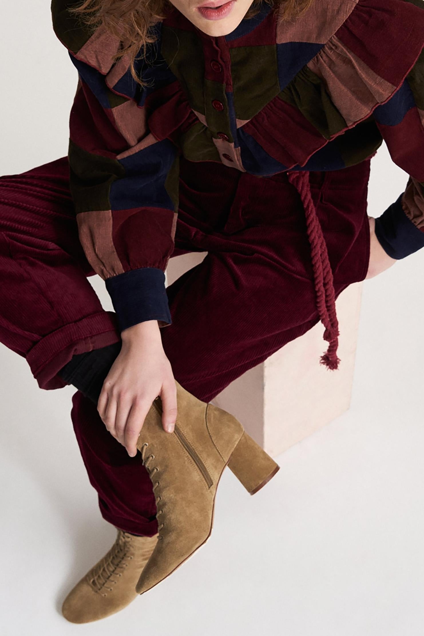 Corduroy patchwork blouse in burgundy and dark blue tones. Round neck. Triangular neckline with ruffles. Loose sleeves tightened by button cuffs. Also available in brown. This vintage blouse will bring a splash of colour to your winter wardrobe.