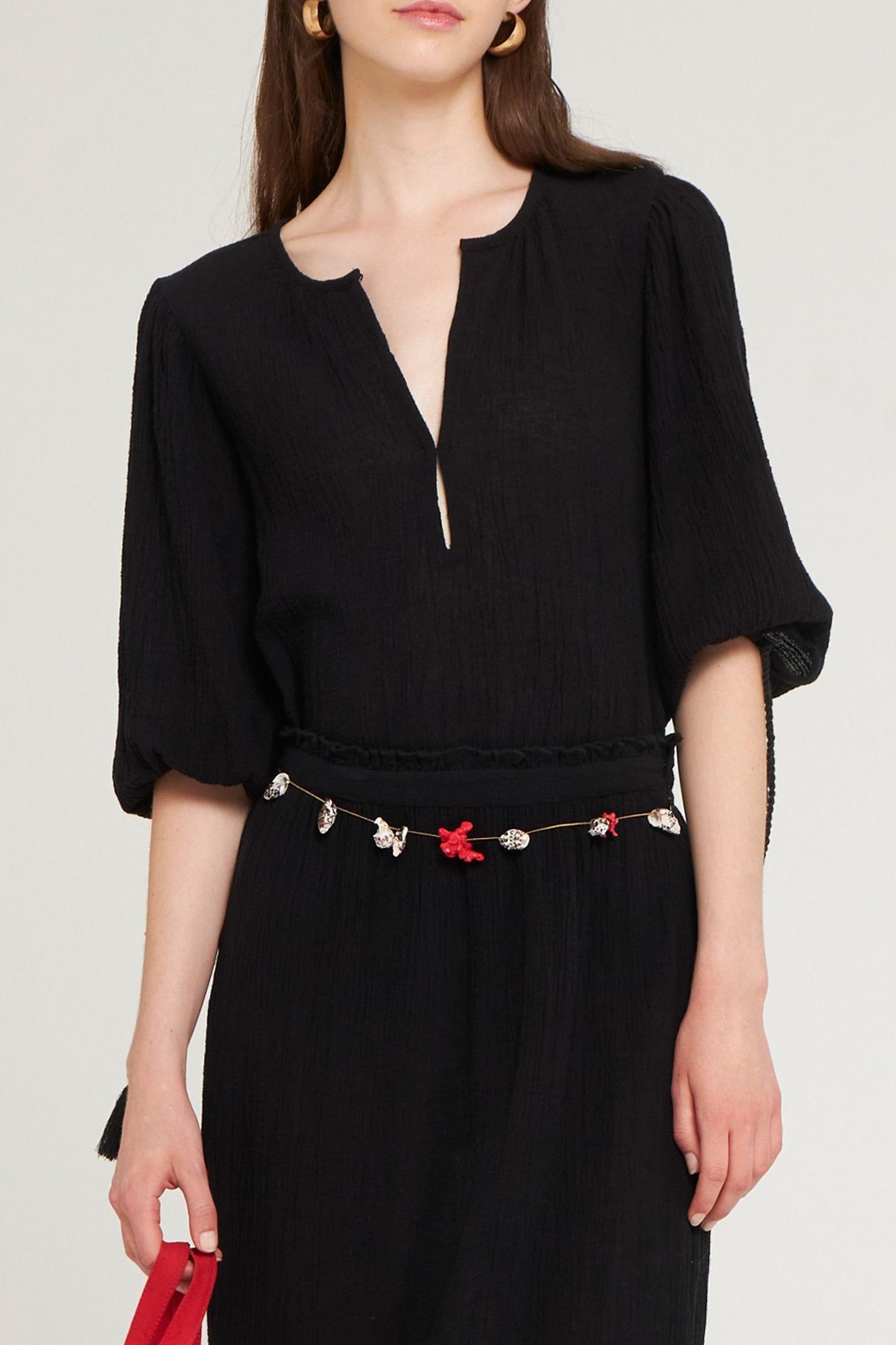 Cotton crepe fluid blouse. Round collar with slit, fastens with three concealed hooks. Two twisted ties with pompoms at the neckline and wrists. Handmade pompoms. Elastic inserted into the wrist.
