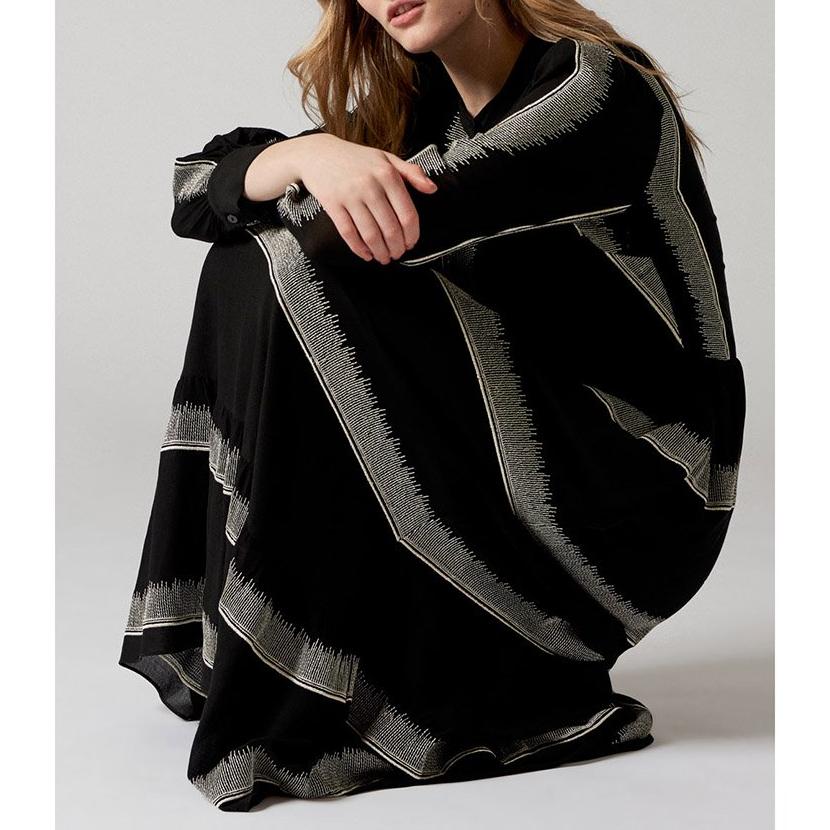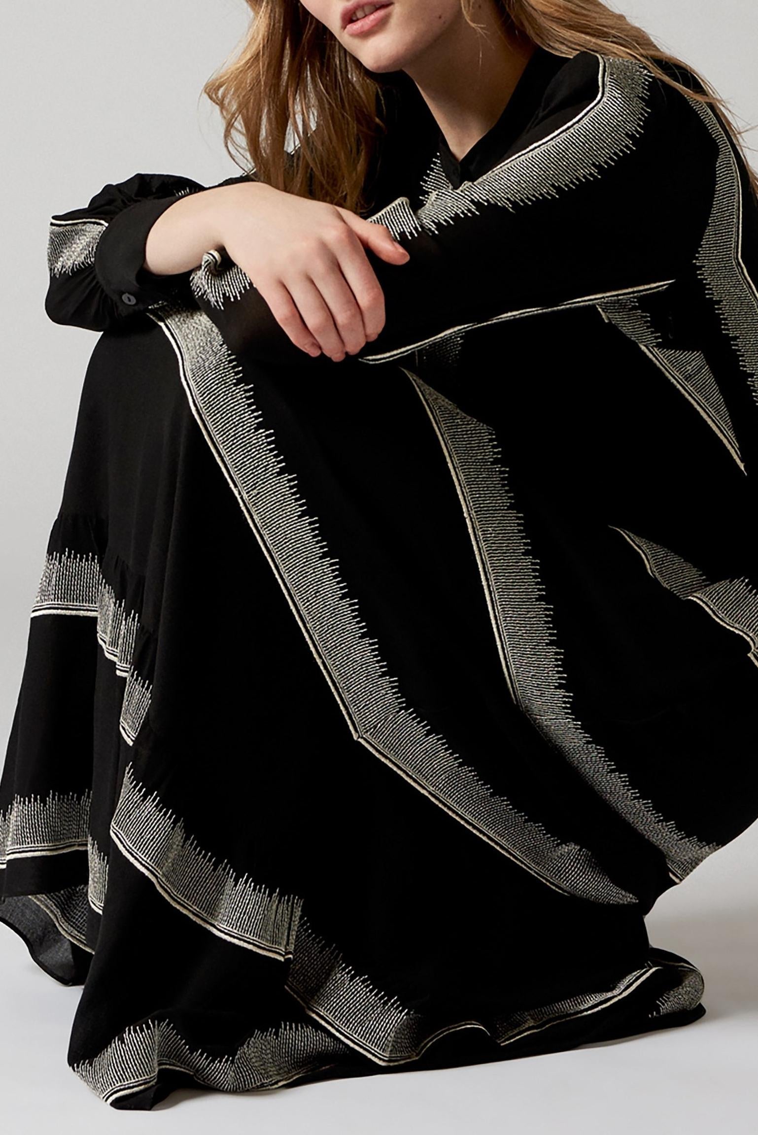 Long black dress. All-over embroidered friezes in silver. Round neck. Tone-on-tone button placket. Long, loose sleeves tightened at the cuffs. Slightly flared at the hem. Our uniquely elegant Linsey long dress will be perfect for the Holiday season.