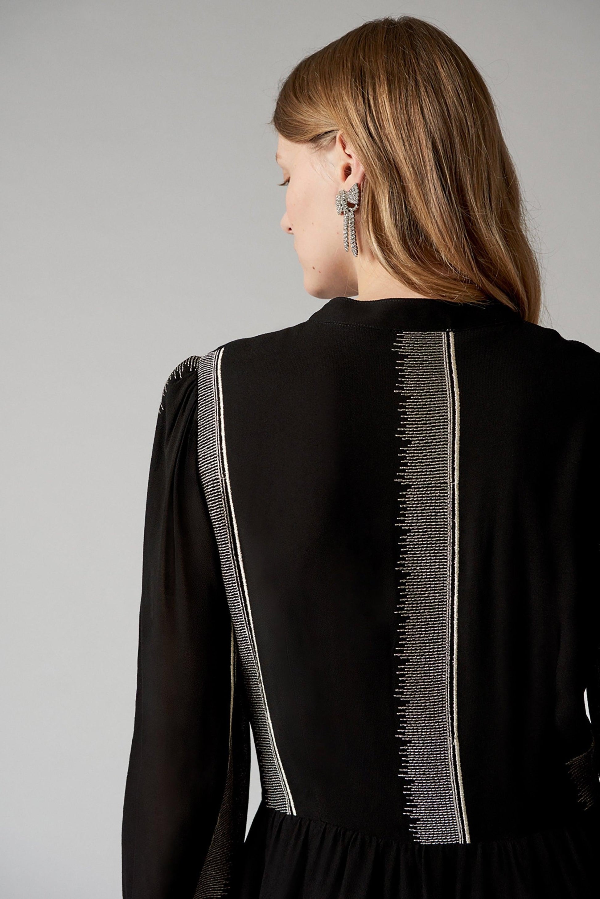 Short black dress. All-over embroidered friezes in silver. Round neck. Tone-on-tone button placket. Long, loose sleeves tightened at the cuffs. Slightly flared at the hem. Our uniquely elegant Linsey short dress will be perfect for the Holiday season.