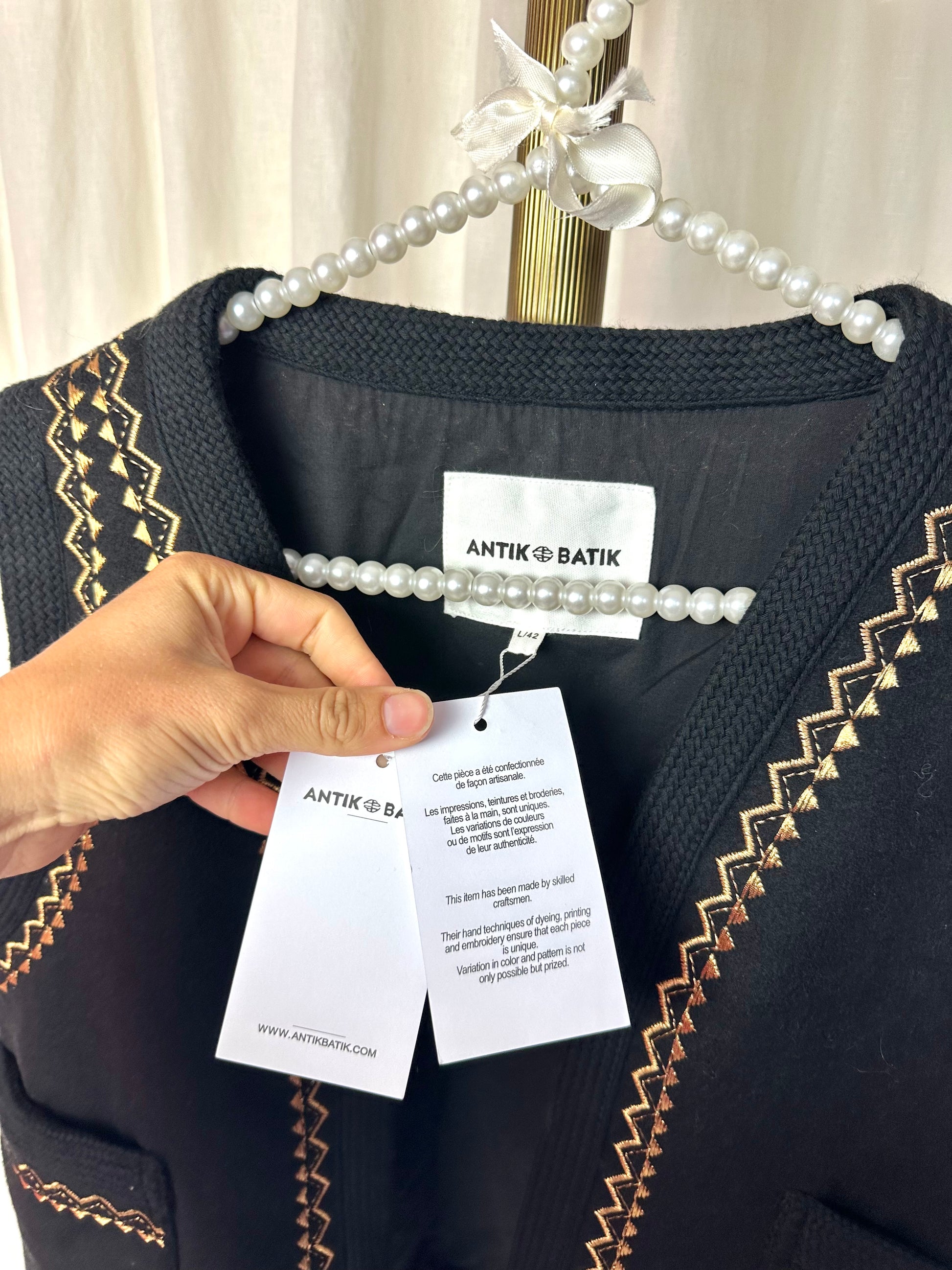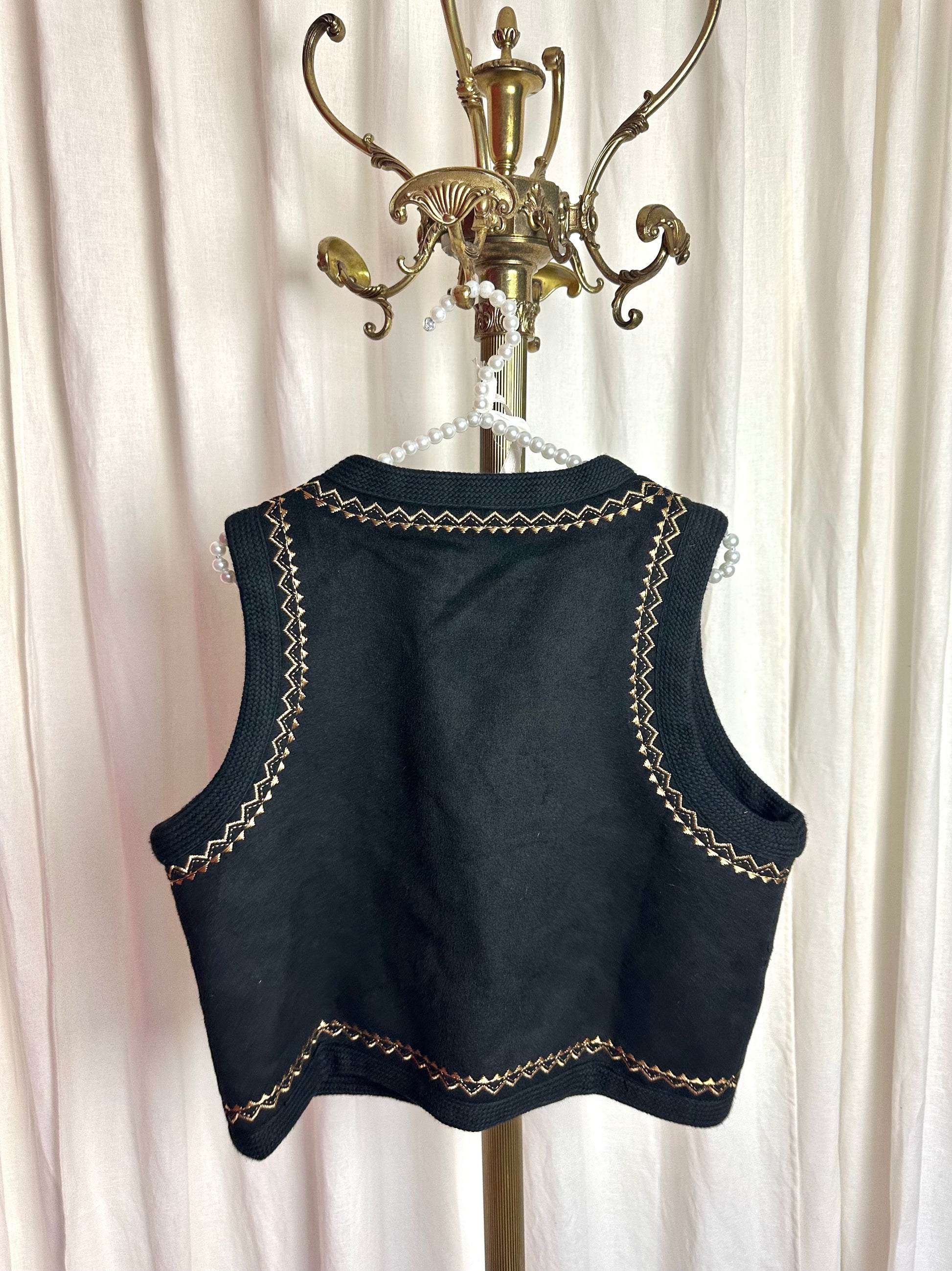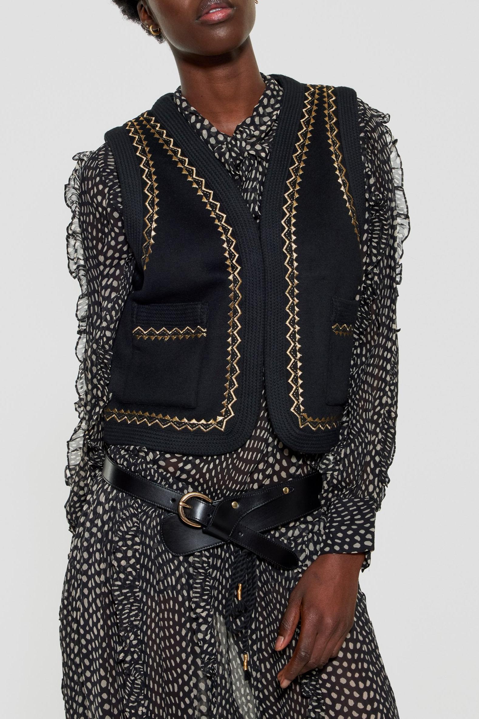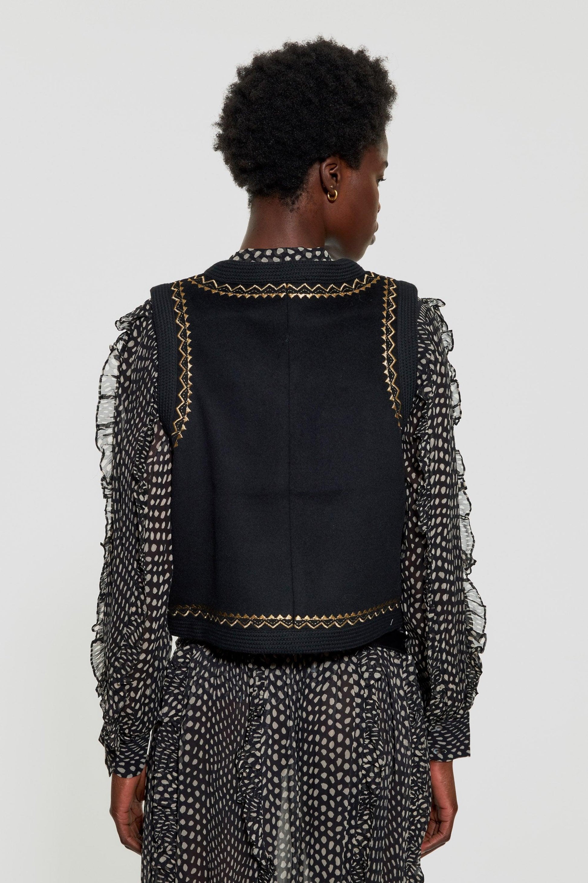 Gilet sans manches en mélange de laine brodé. Deux poches latérales. Broderies et tresses au niveau de l’encolure, des épaules et des poches.