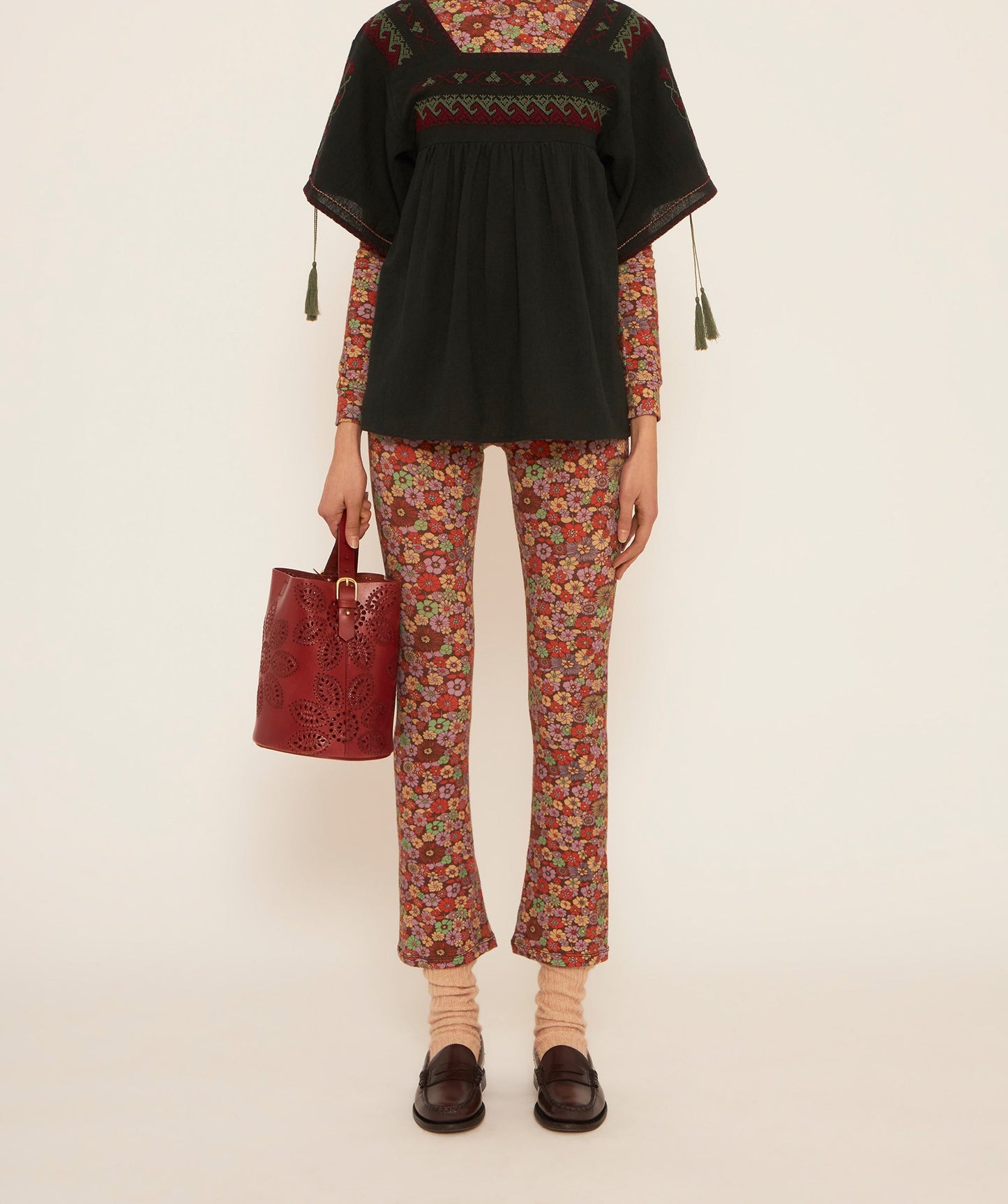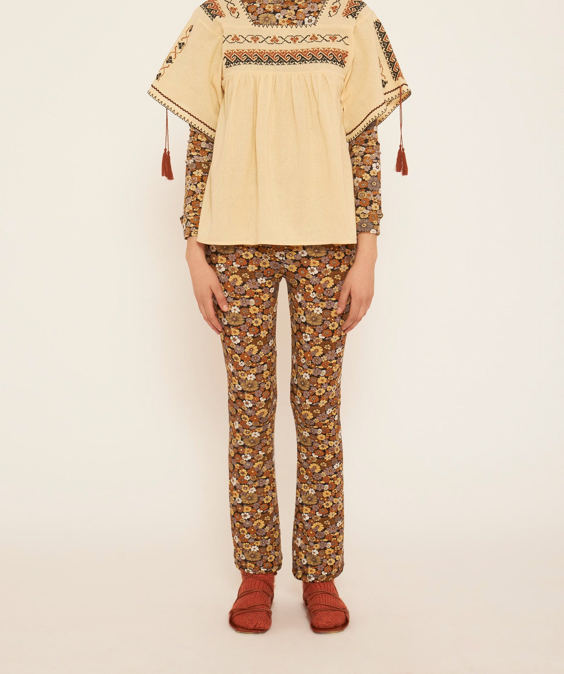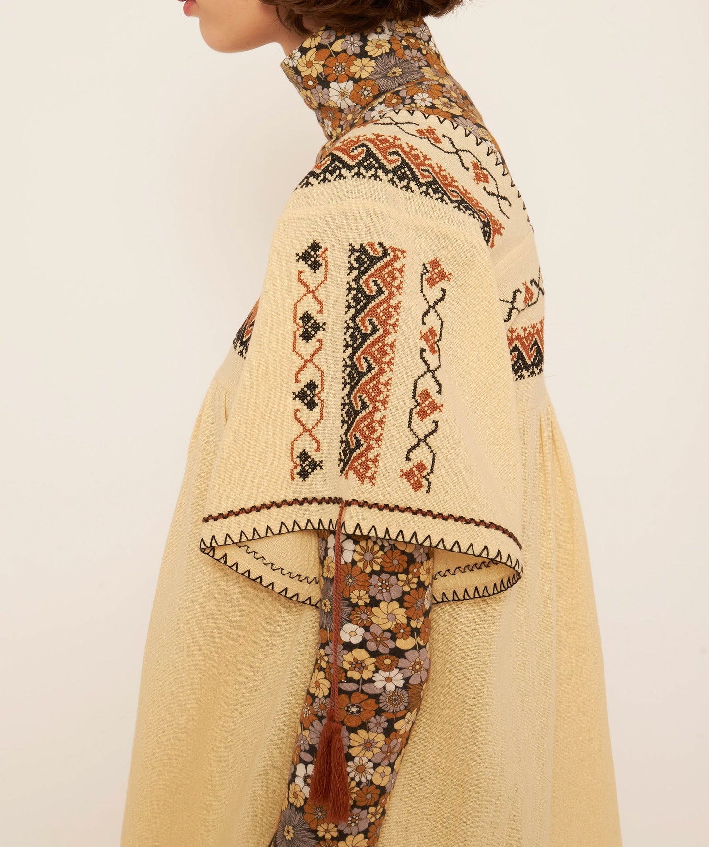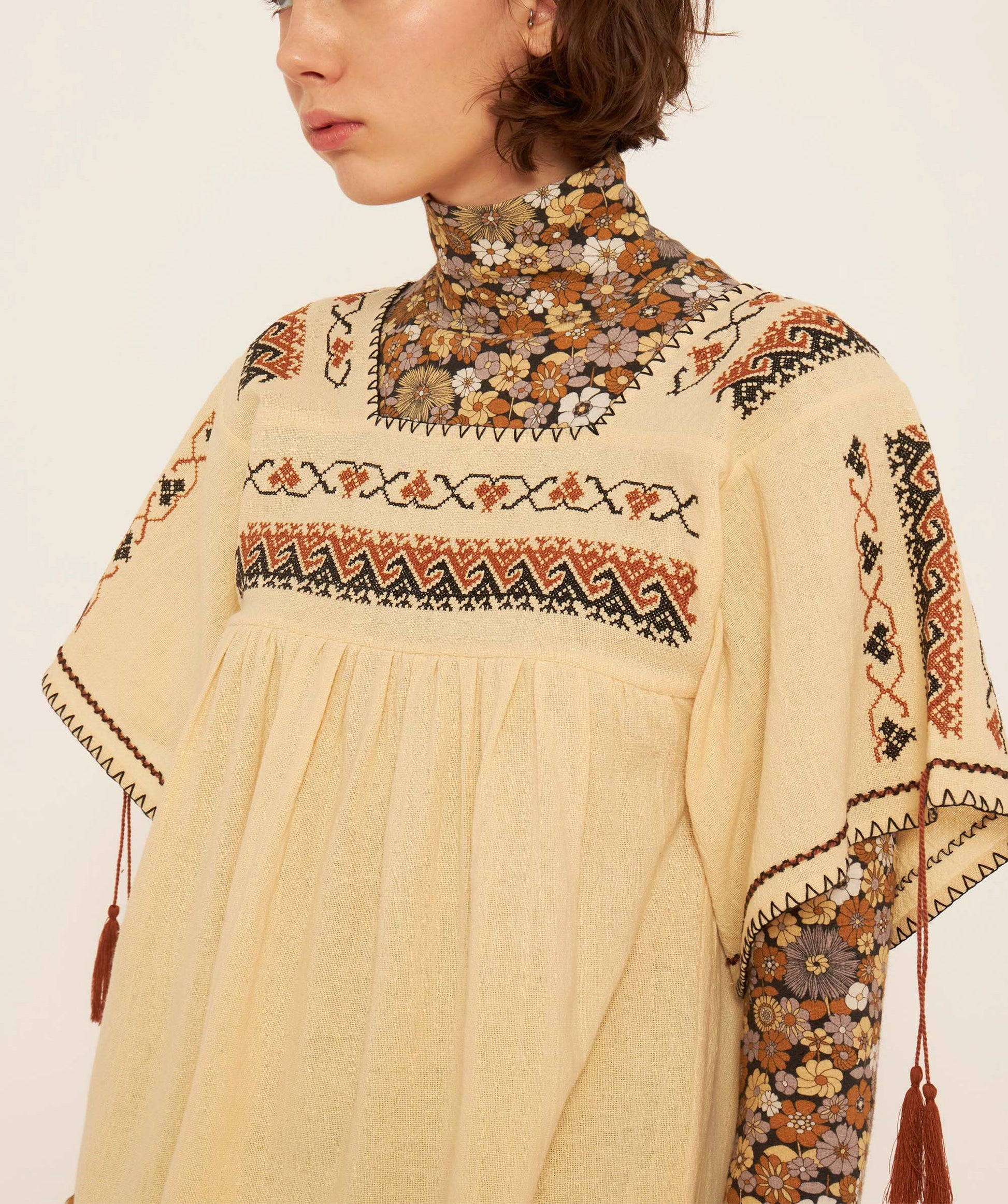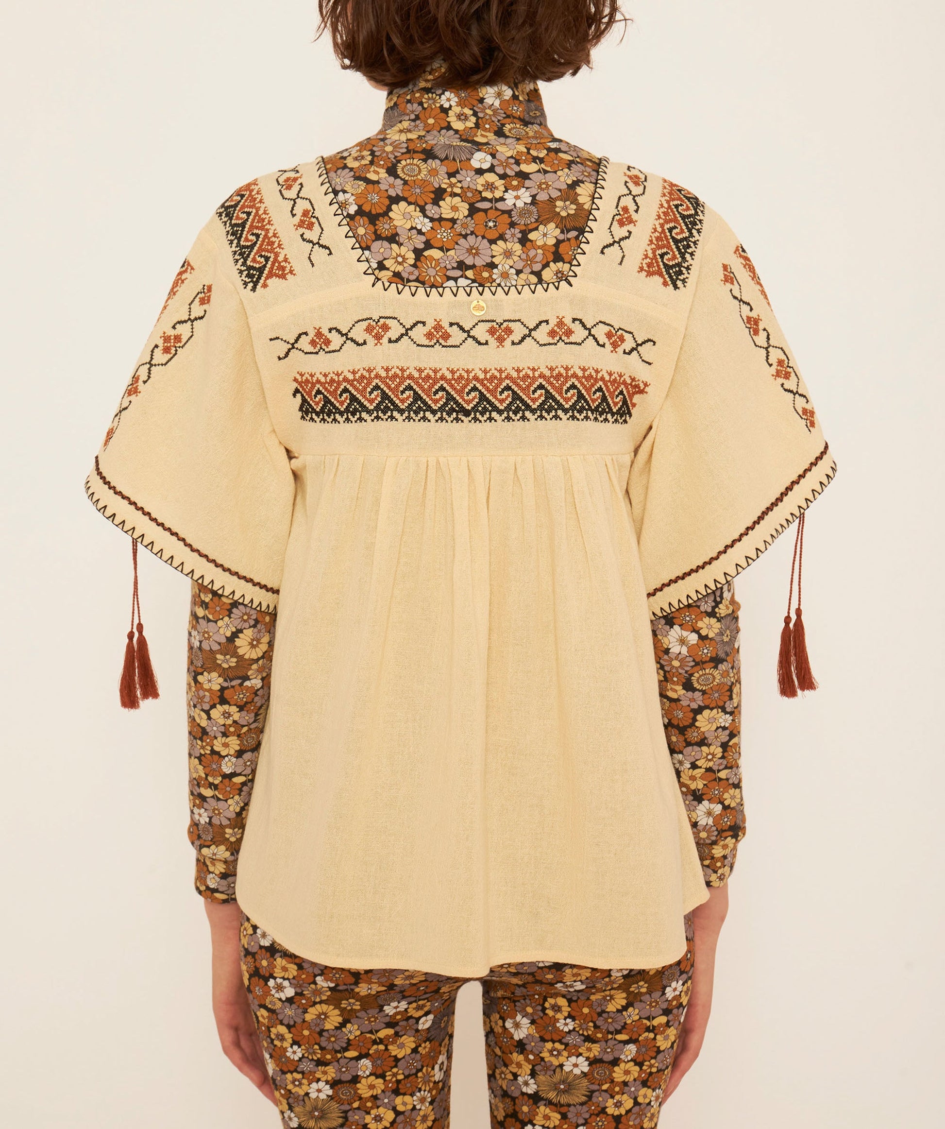 Top brodé à Manches courtes en Crêpe de Coton crème. Broderies du col et des poignets réalisées à la main. Broderies en point de croix réalisées artisanalement. Points zigzag au poignet réalisés à la main. Liens aux bas des Manches permettant de les ressérer. Fentes sur les côtés.