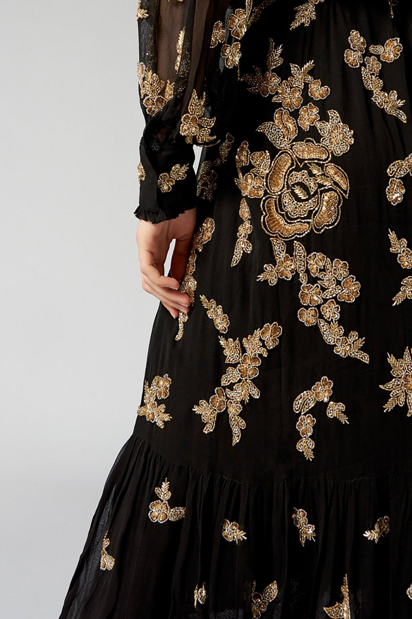 Sheer black dress. All-over floral pearl and gold sequin embroidery. V-neckline. Long straight sleeves tightened at the cuffs. Lined slip. Comes with its own belt. This elegant, sparkling evening dress will make a splash during the most formal of evenings. It can be worn loose or belted for a most feminine silhouette.