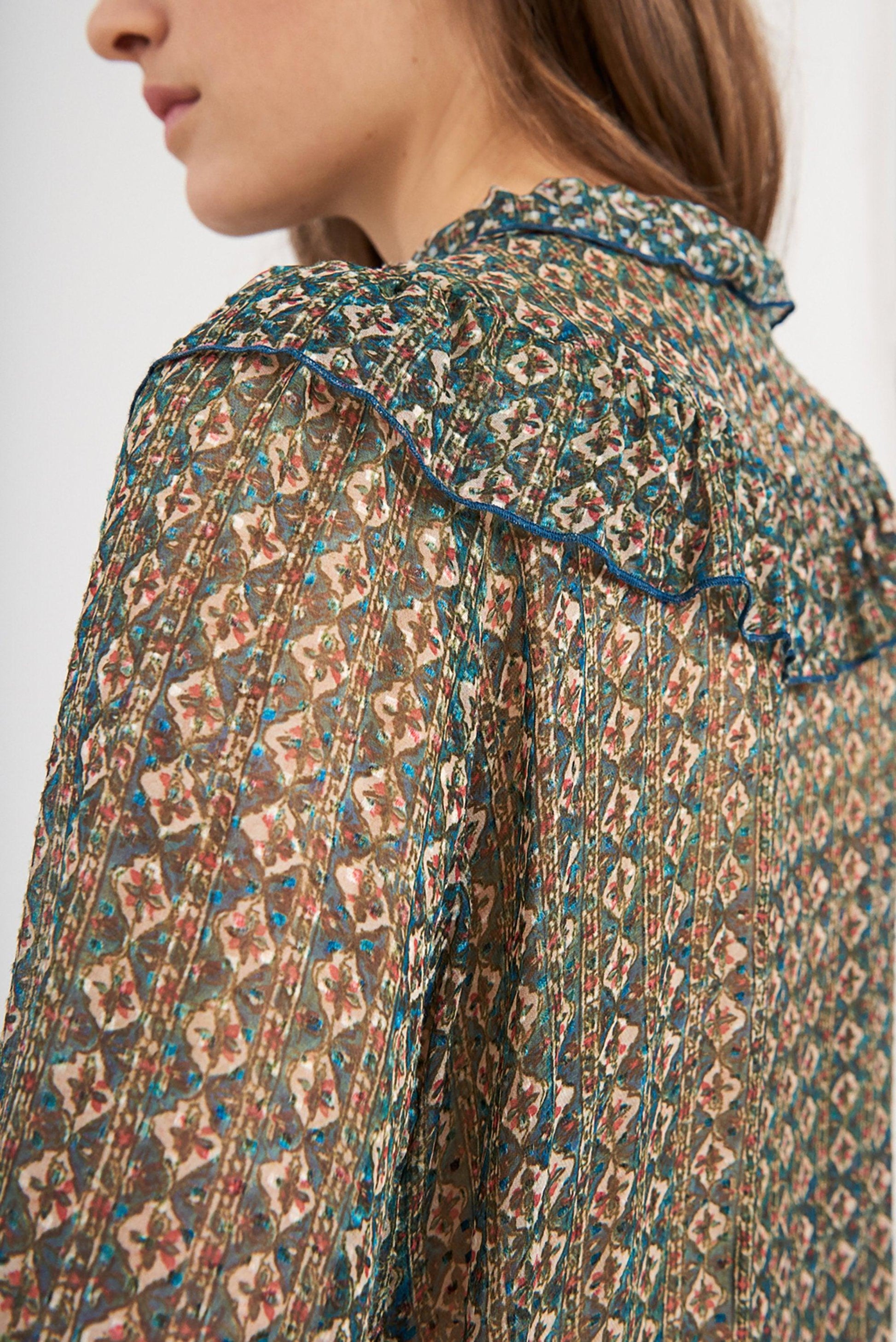 Sheer black blended silk blouse. Jacquard woven patterns in blue and green tones. Round neck with ribbon ties. Ruffled breastplate. Long sleeves tightened at the cuffs. This lightweight silk-blend blouse is exquisitely comfortable to wear.