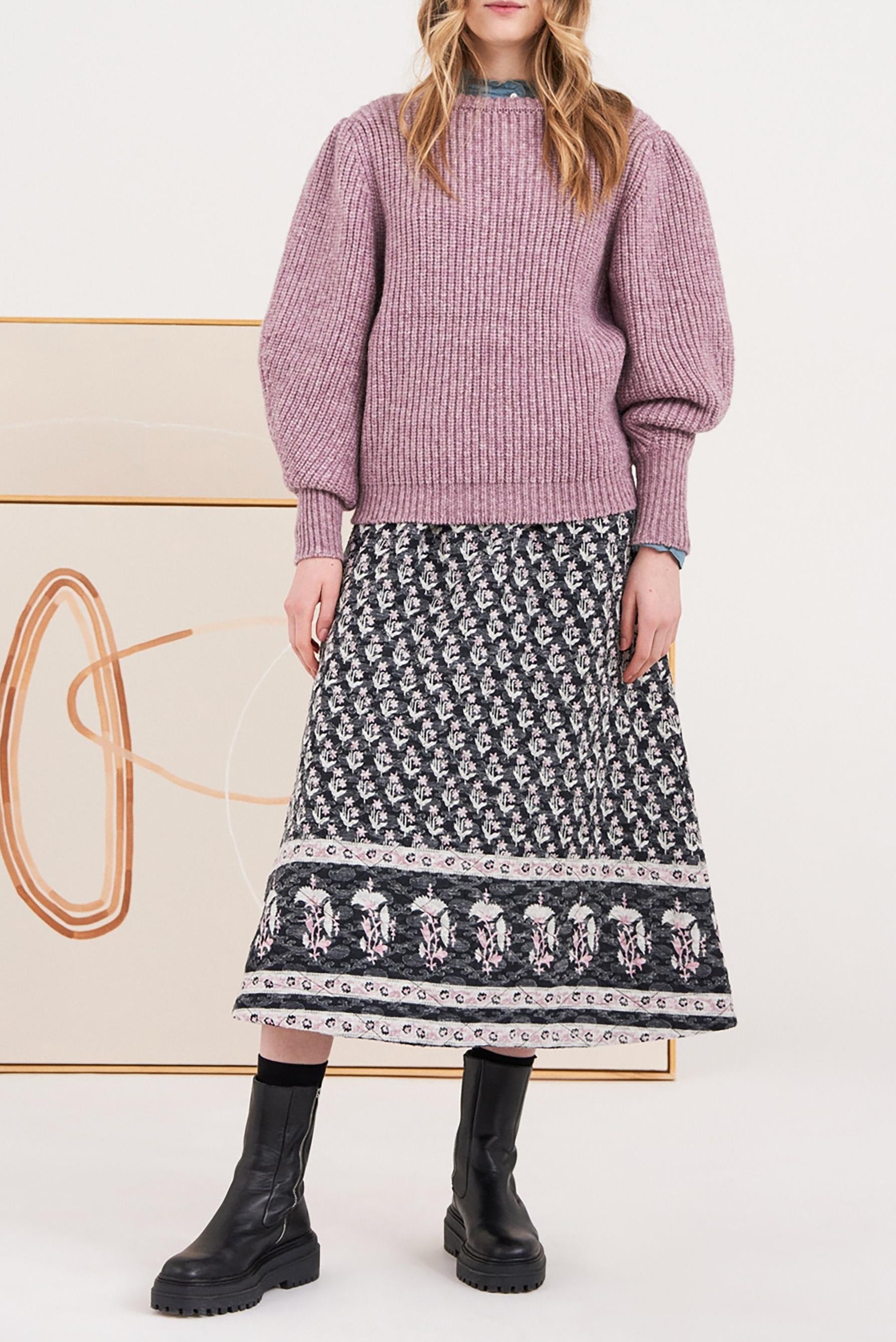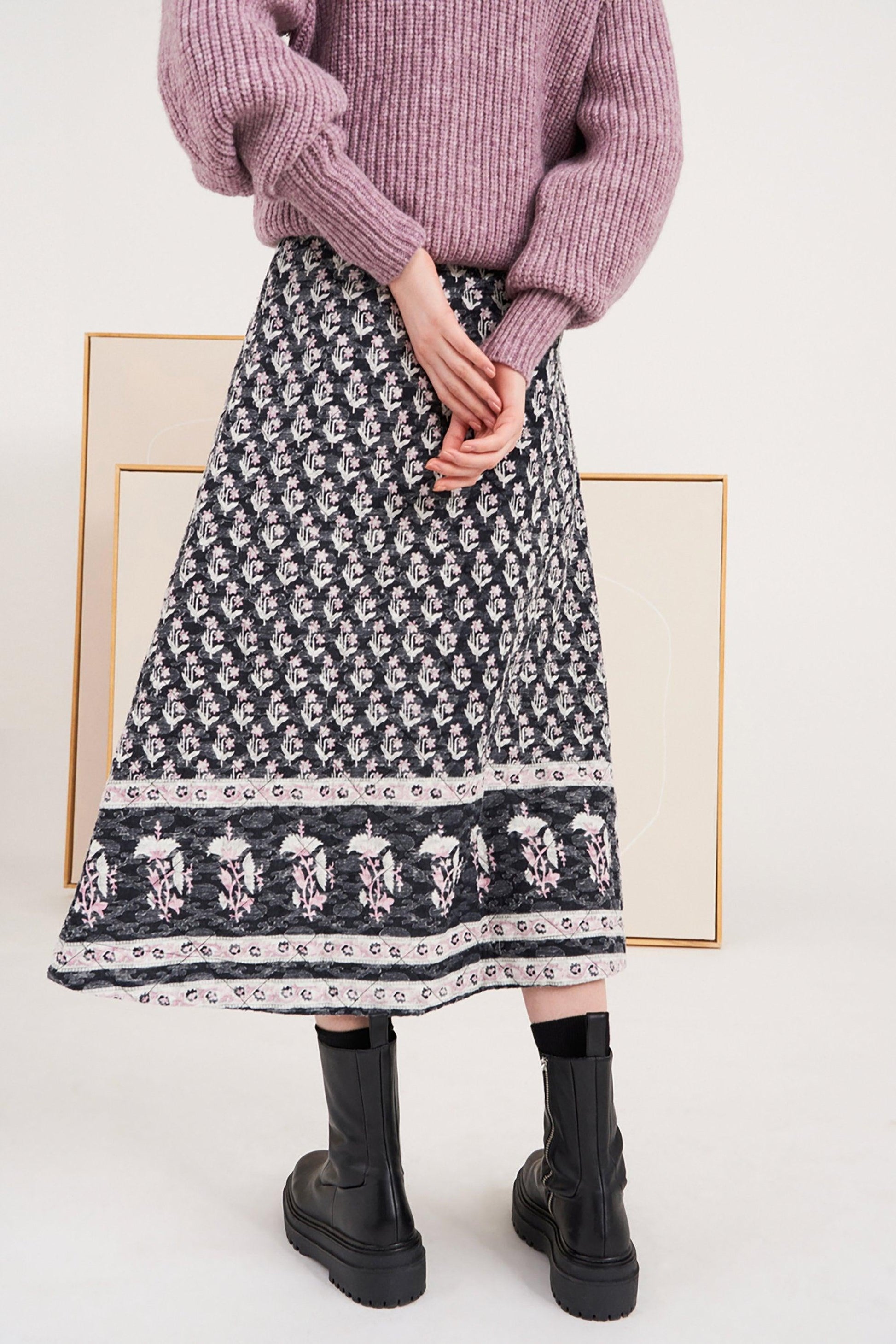 Long cotton skirt. Floral patterns woven in jacquard in pink and blue tones. Black topstitching. Trapezoid cut. This unique skirt with follow you through all your daily activities. The skirt's jacquard-woven pattern makes it an original piece displaying unique craftsmanship.