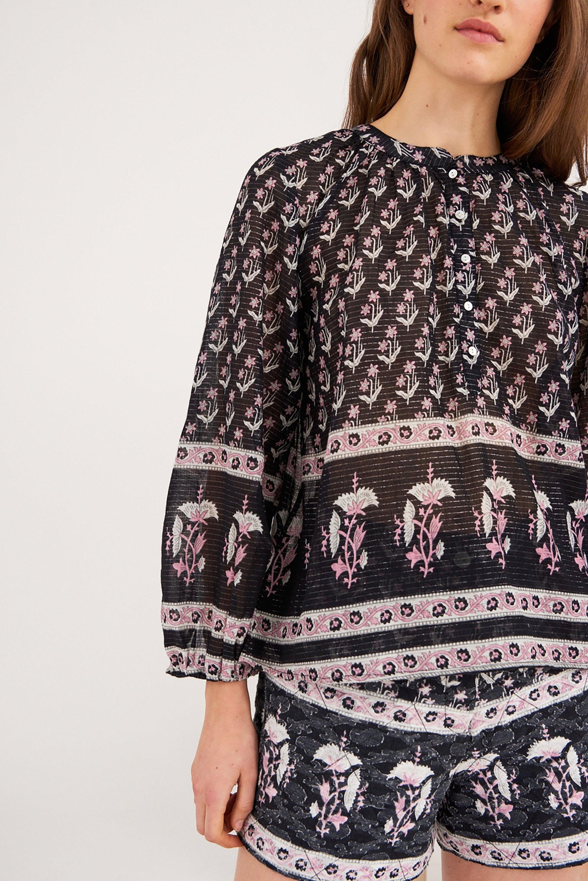 Flowing sheer blouse in cotton veil. Floral prints in blue and pink tones. Round neck with button closure. Long sleeves with button cuffs.