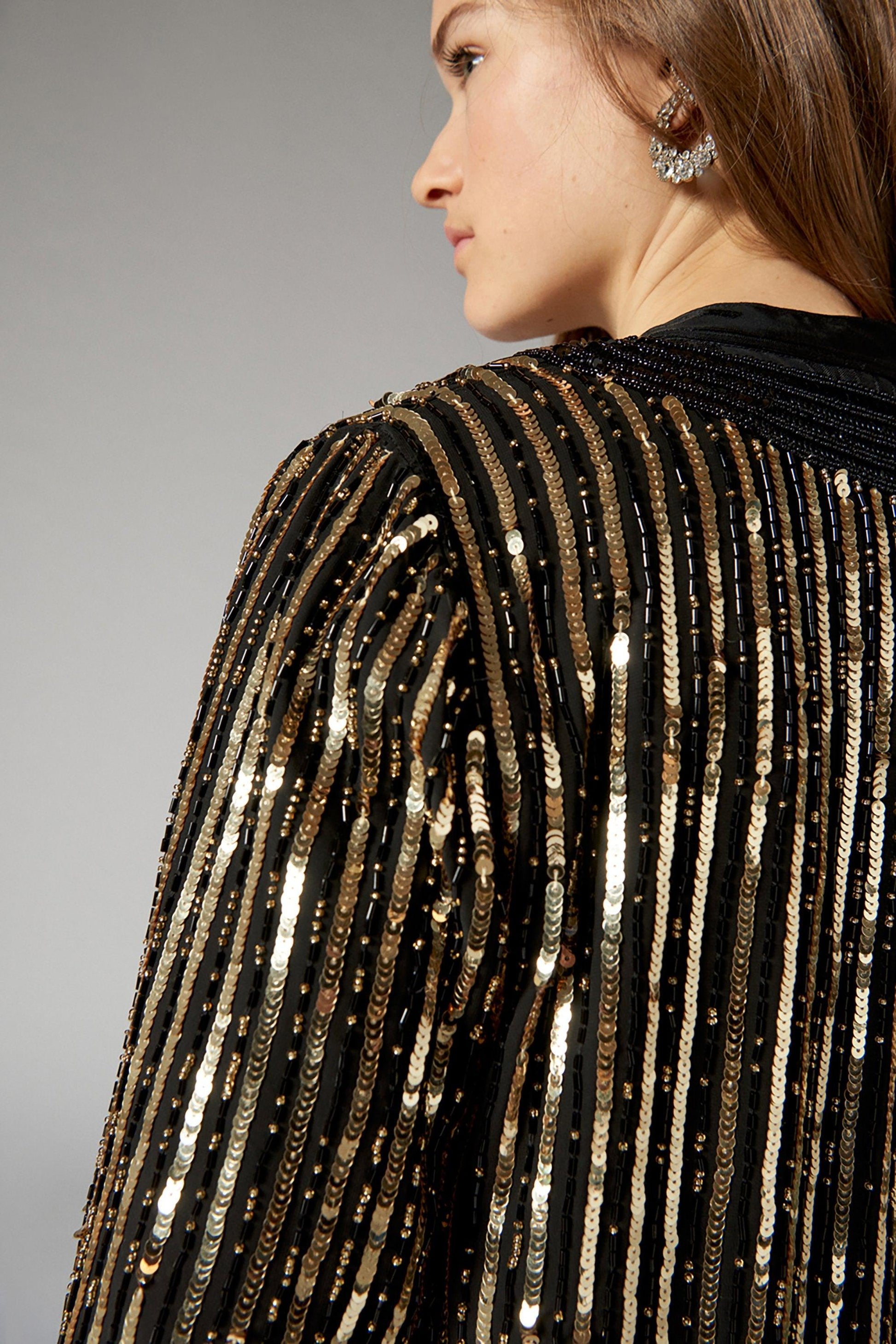 Jacket fully embroidered in pearls and sequins. Round neck. Button placket and cuffs embroidered with black sequins. Long sleeves. This jacket can be worn open or closed using the hook-and-loop closure on the front. This unique, shiny jacket displaying embroidery craftsmanship will be perfect for brightening up an evening outfit.