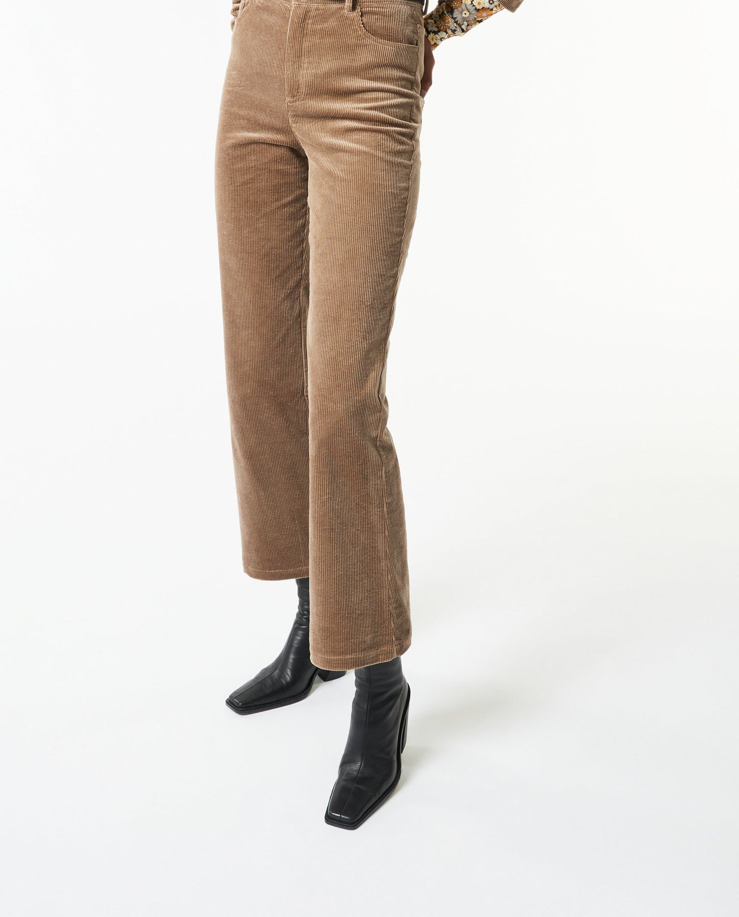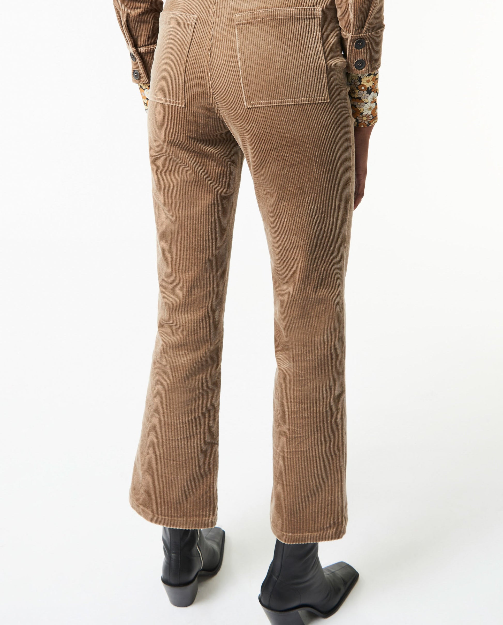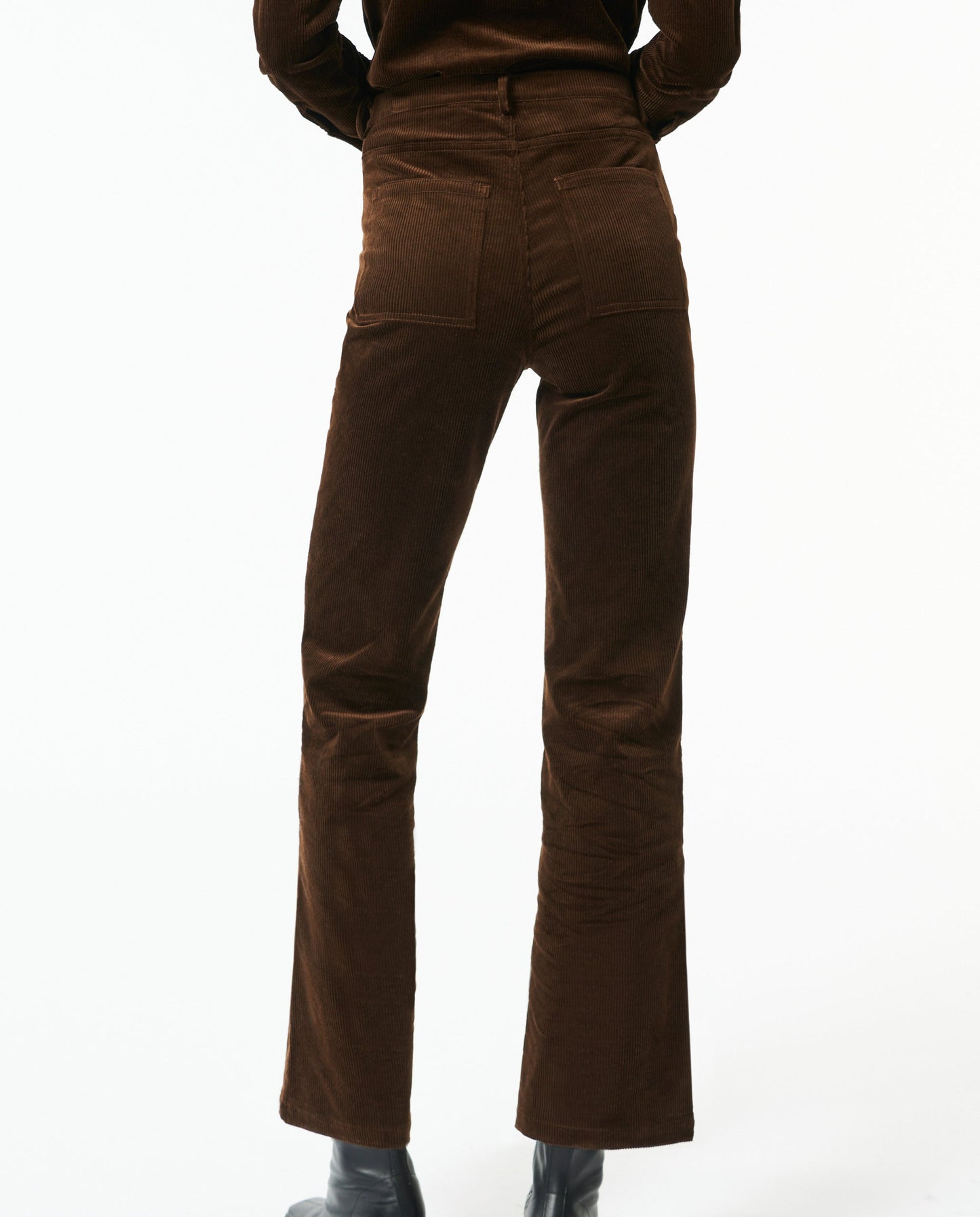Pantalon 5 poches en velours côtelé légèrement stretch. Taille haute. Coupe flare. Deux poches côtés et une poche ticket à l'avant. Deux poches plaquées à l'arrière. Fermeture bouton et zip devant
