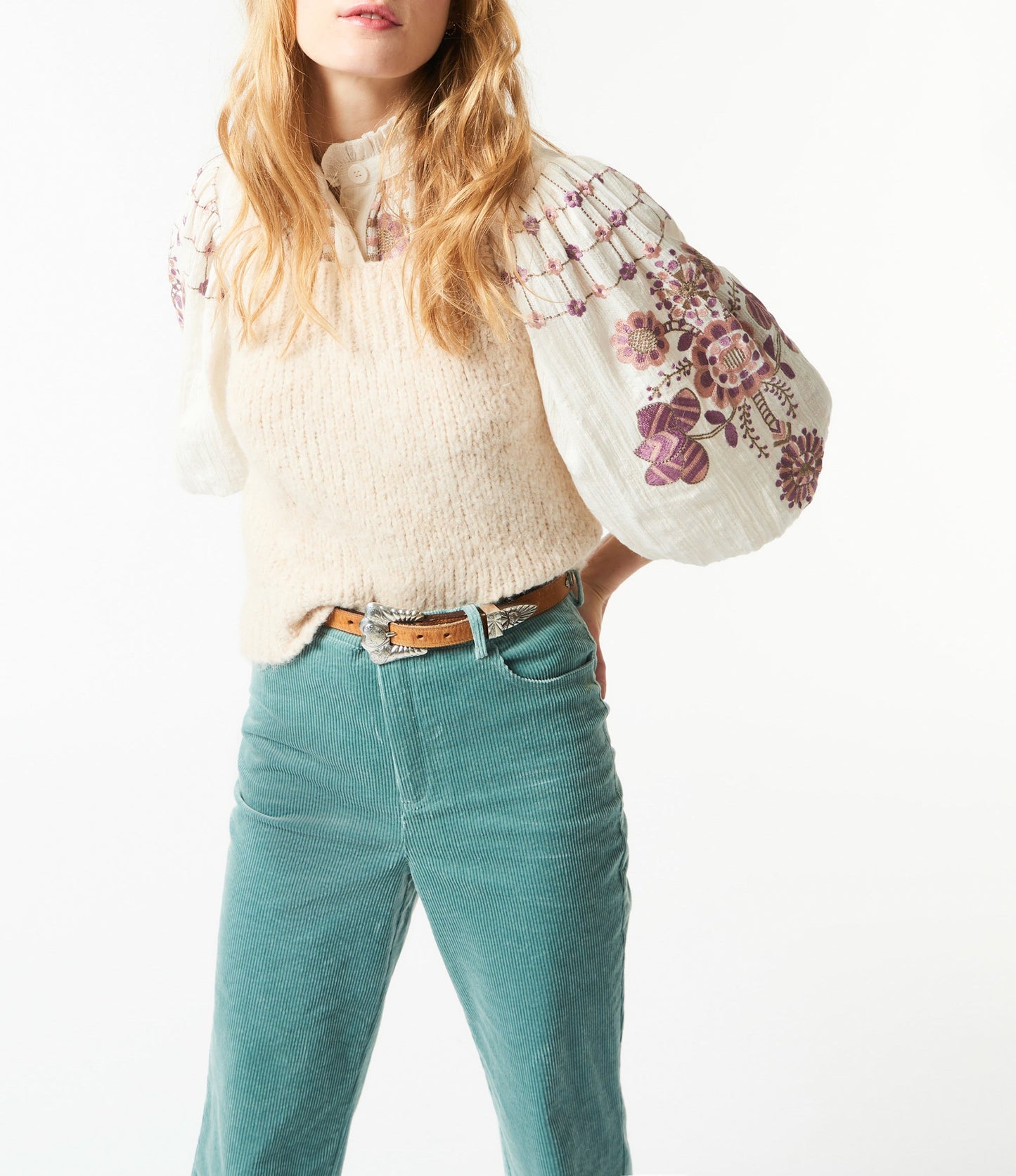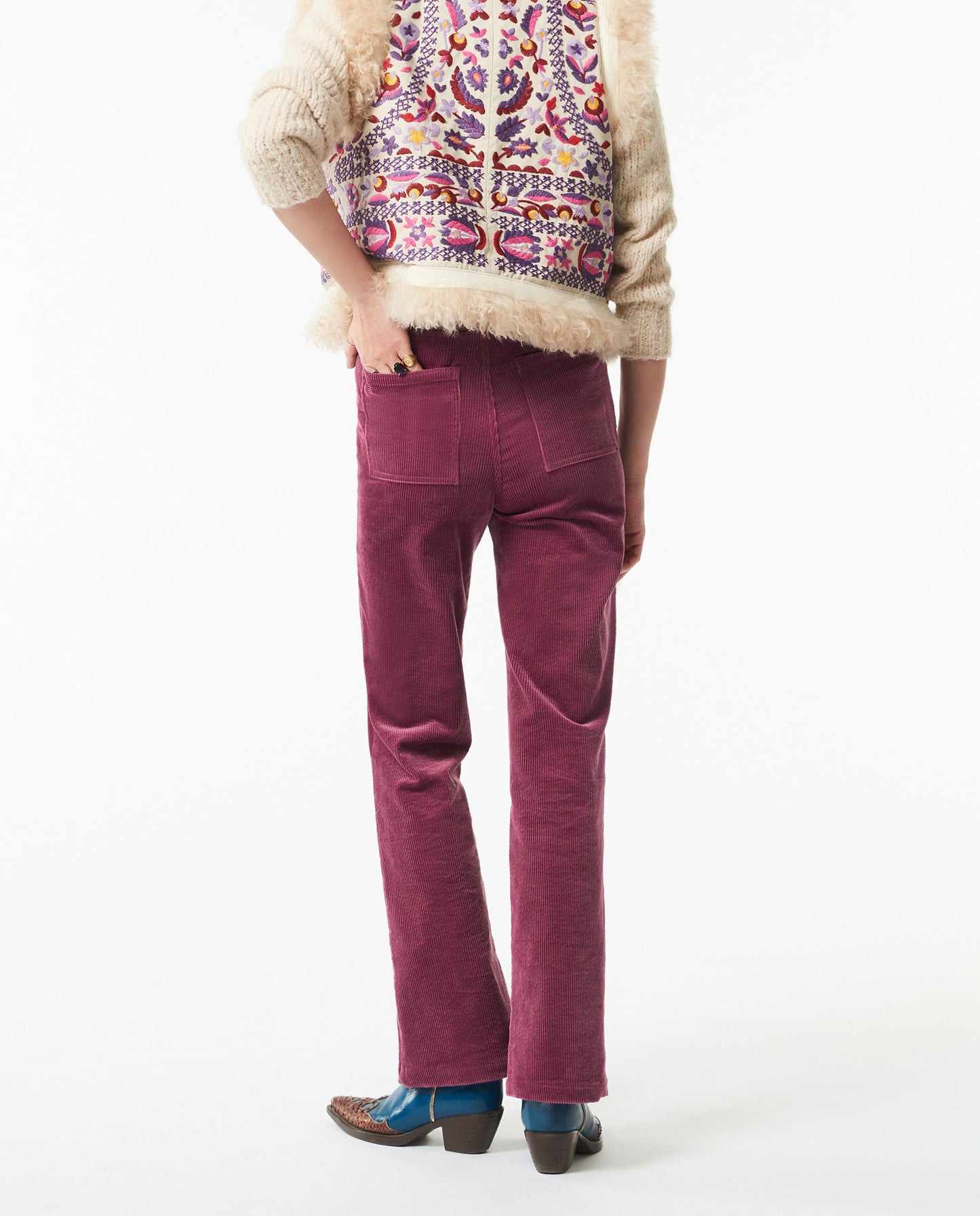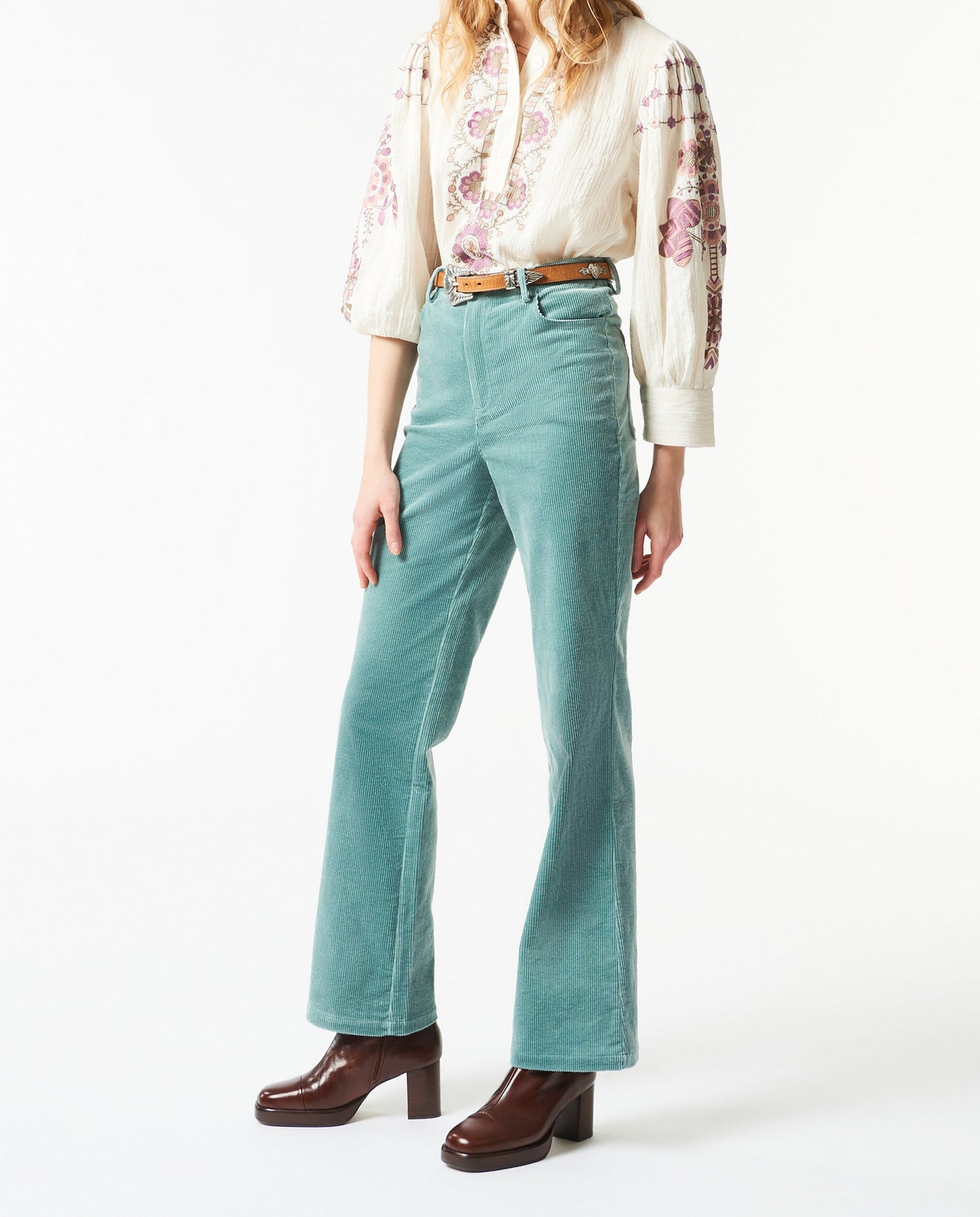 Pantalon 5 poches en velours côtelé légèrement stretch. Taille haute. Coupe flare. Deux poches côtés et une poche ticket à l'avant. Deux poches plaquées à l'arrière. Fermeture bouton et zip devant