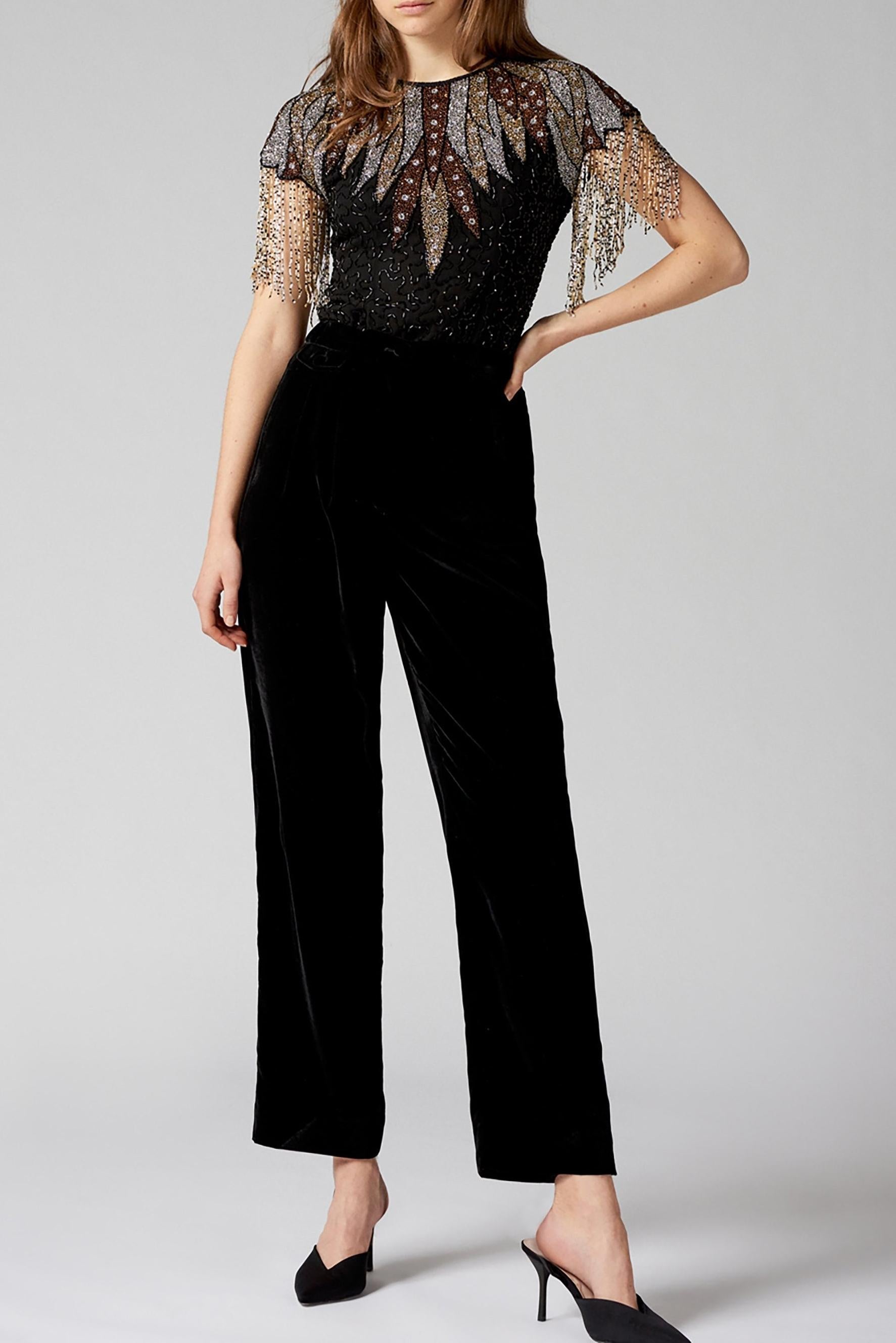 Black top fully embroidered with patterns in beads and sequins. Body-con cut. Short sleeves decorated with beaded fringes. Round neck. Halter back with button closure. This sparkling 1920s-inspired top will be perfect for the Holiday season.