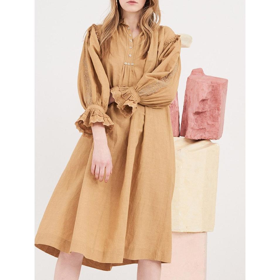 Camel-coloured cotton and linen midi dress. Loose trapezoid fit. Round neck with buttons. Long sleeves tightened at the wrists with elasticated cuffs. Collar, armholes and cuffs decorated with lace ruffles. This feminine dress will become a classic winter piece. Also available in black.