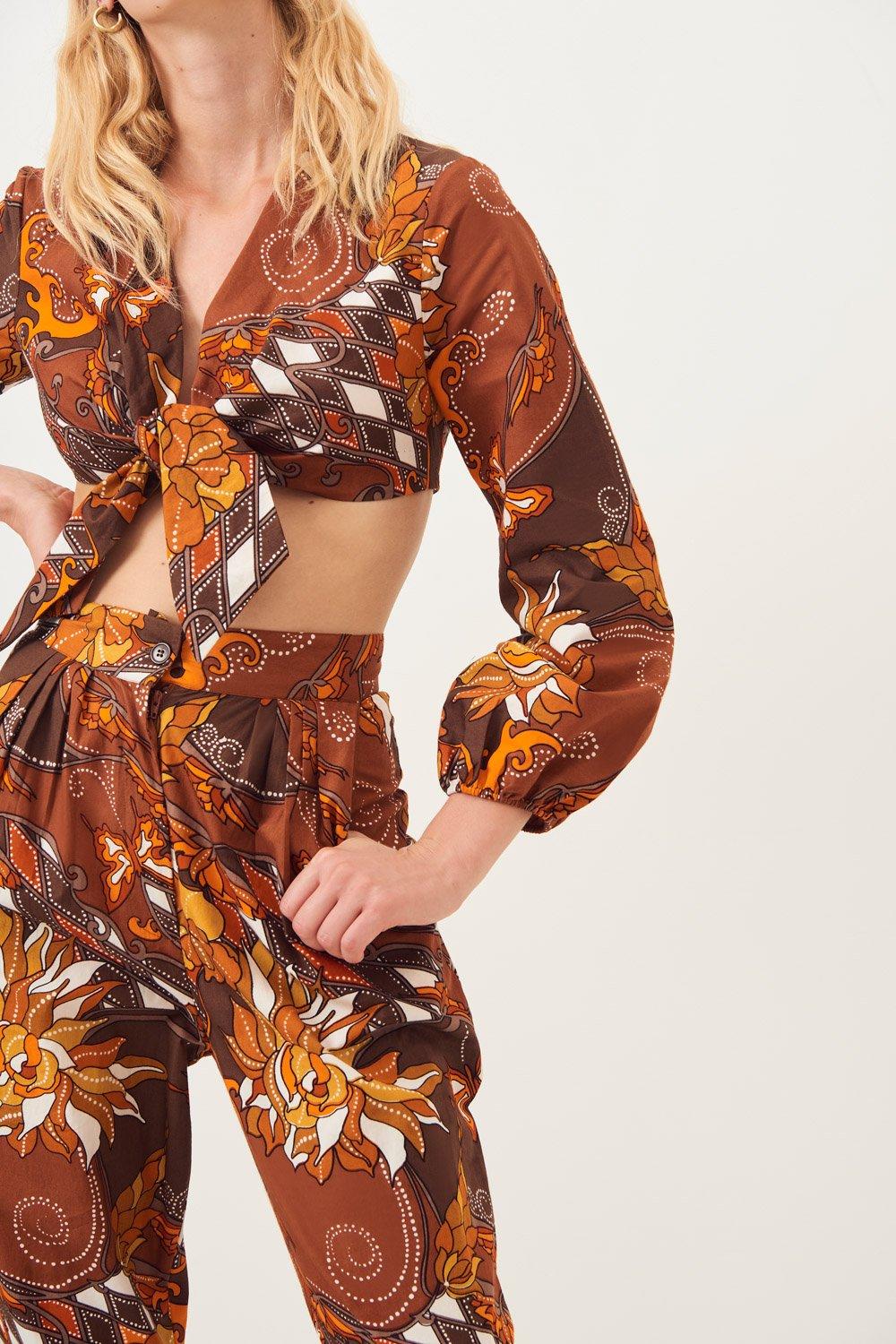 Cotton carrot pants printed with a floral pattern. Print in shades of brown and orange. Our Ramba pants adds a modern touch to the classic carrot pant cut for an ultra-feminine look. Fastened at the waist with a button. Two slanted side pockets. These pants will be a season's perfect basic, especially when paired with our Ramba top for an all-over printed look.