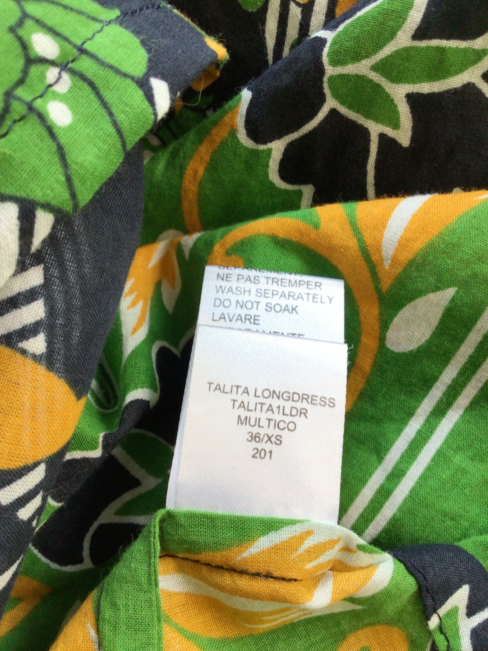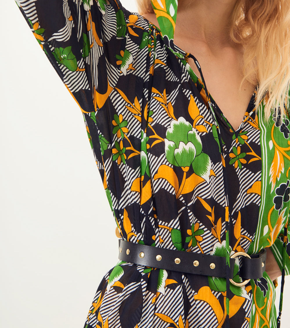 Maxi robe évasée et fluide en voile de coton semi-transparente. Col rond, fermeture avec lien à nouer. Manches longues resserrées aux poignets par un noeud. Cette robe longue dans des tons de vert et jaune est parfaite pour une journée plage sur votre maillot de bain. 100% VOILE DE COTON. Cette pièce unique a été confectionnée de manière artisanale. Nos pièces sont délicates et requièrent un lavage à la main à température froide ou un lavage à sec.
