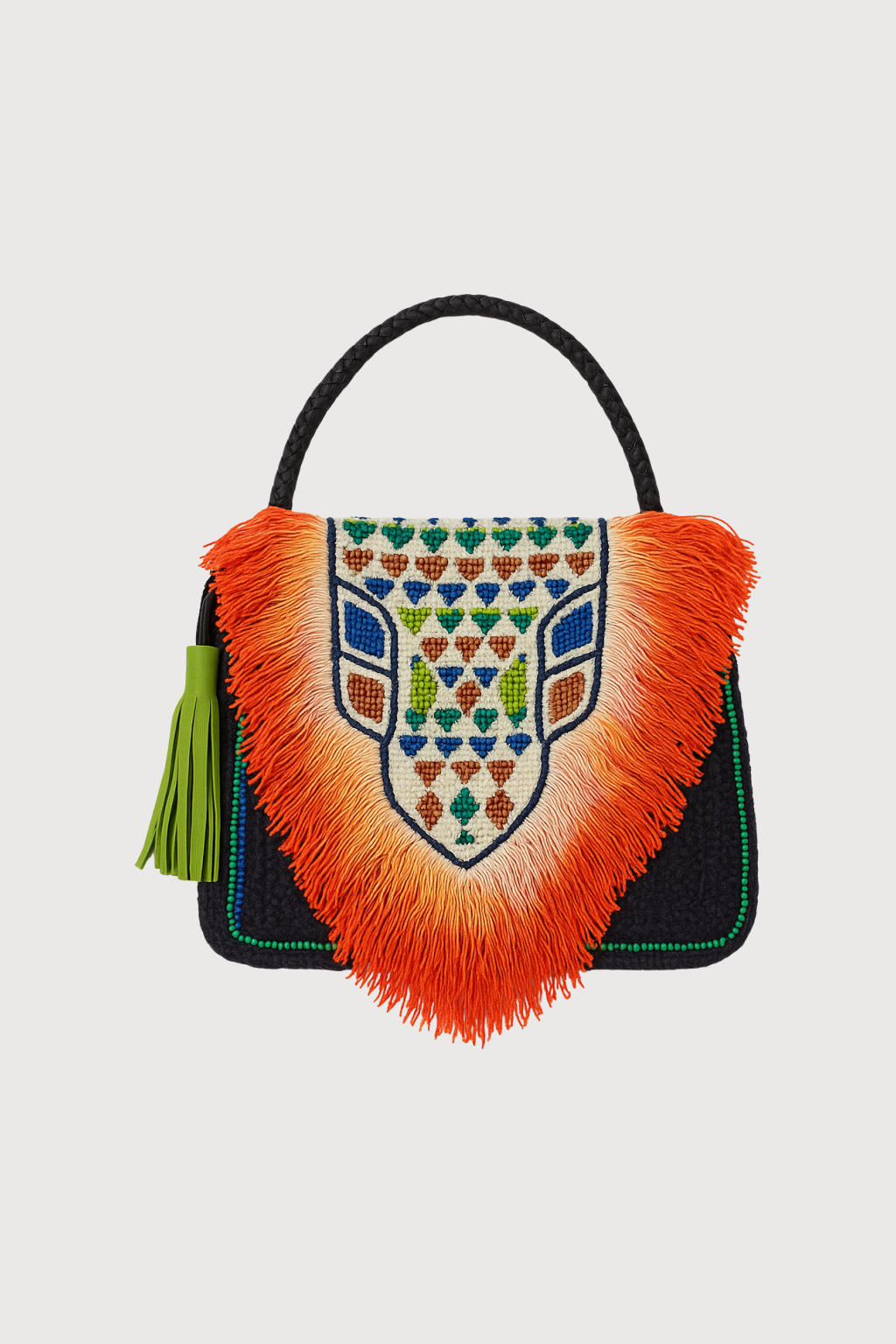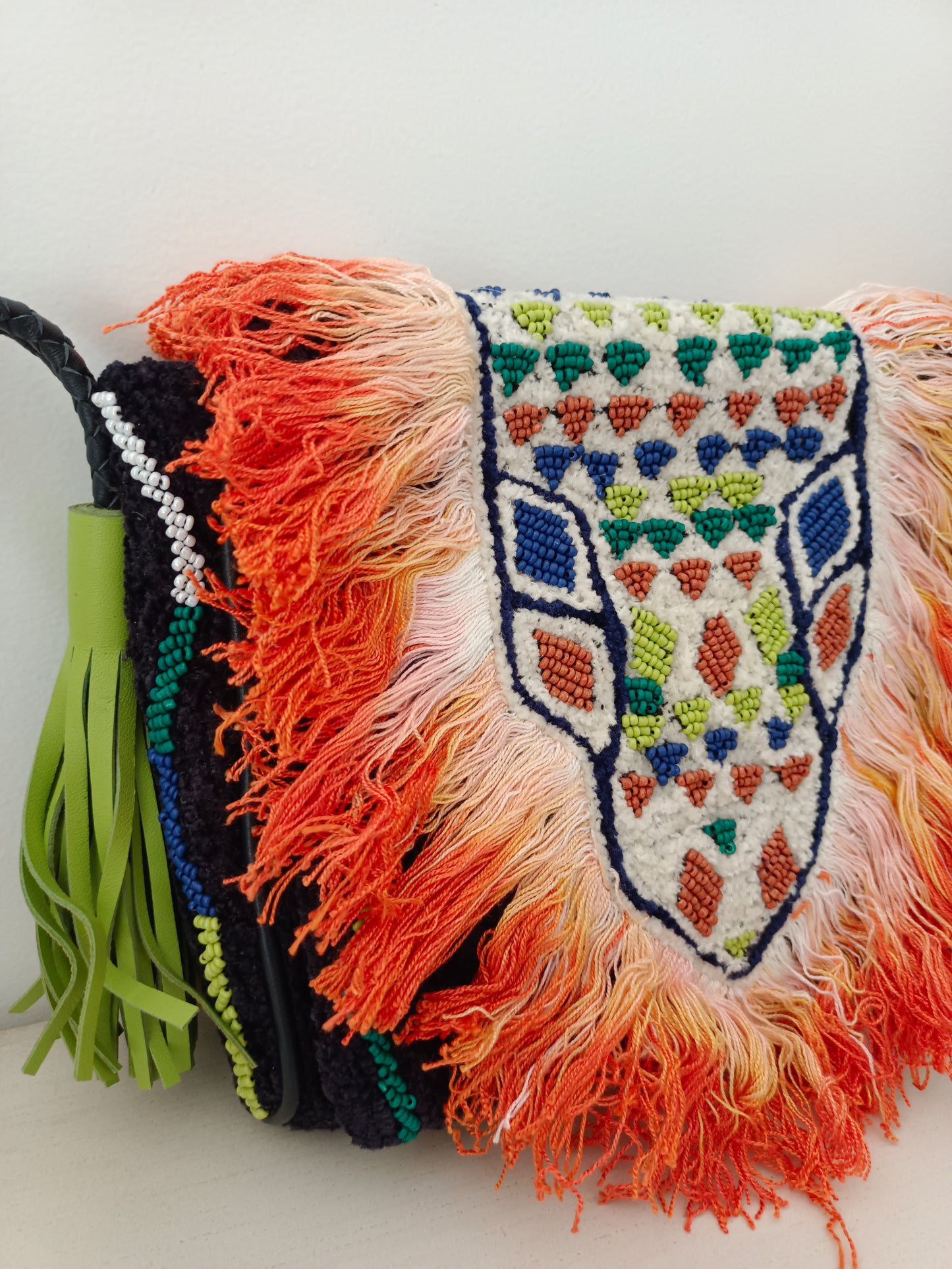 Sac en tissu doublé cuir bleu et empiècement décoratif velour brodé de perles