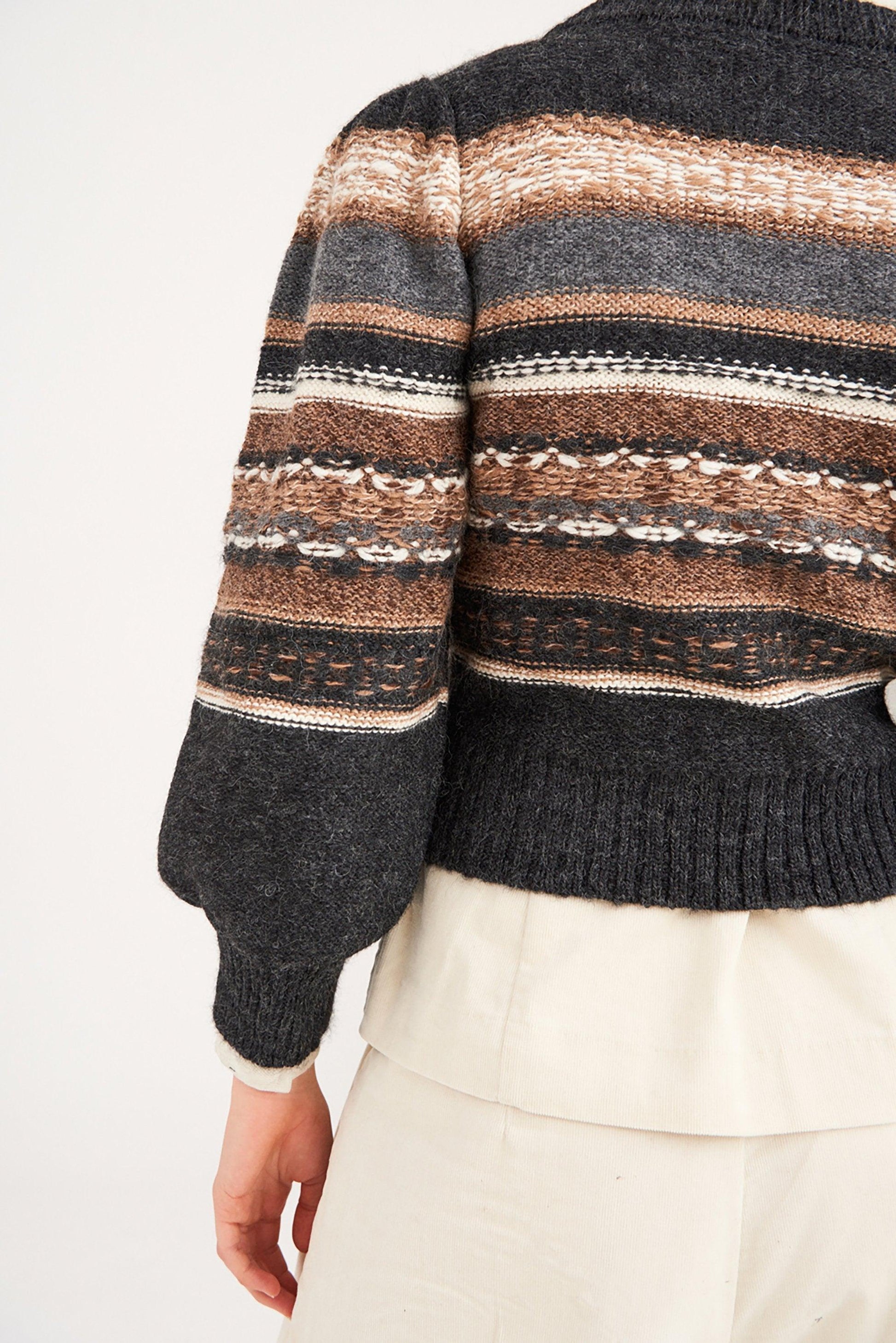 Alpaca sweater. Cropped fit. All-over woven horizontal stripes in earth tones. Balloon sleeves. This warm and comfy 90% alpaca vintage-inspired sweater highlights the unique know-how of Peruvian weaving.