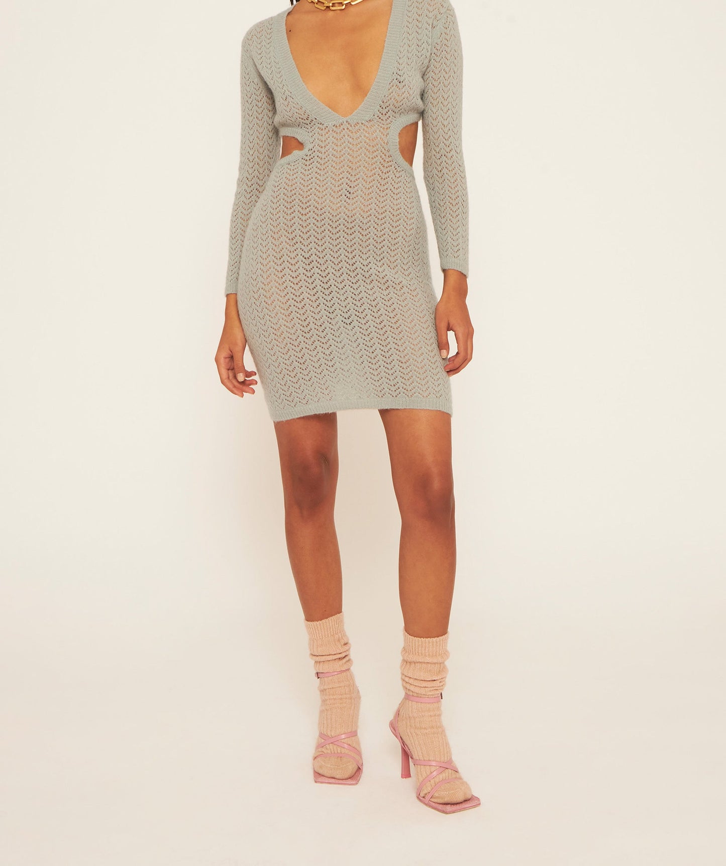 Robe courte cut out en laine mélangée kaki. Maille ajourée. Décolleté plongeant.