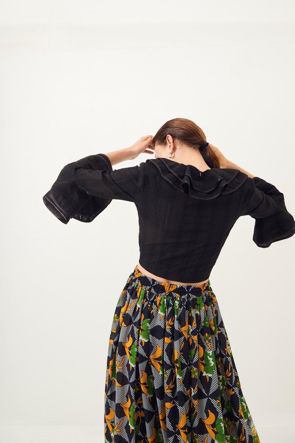 Flared, flowing maxi skirt. Elasticated waist with tie fastening. Fully lined. This maxi skirt in shades of green and yellow can be worn over your swimsuit for a perfect beach day.