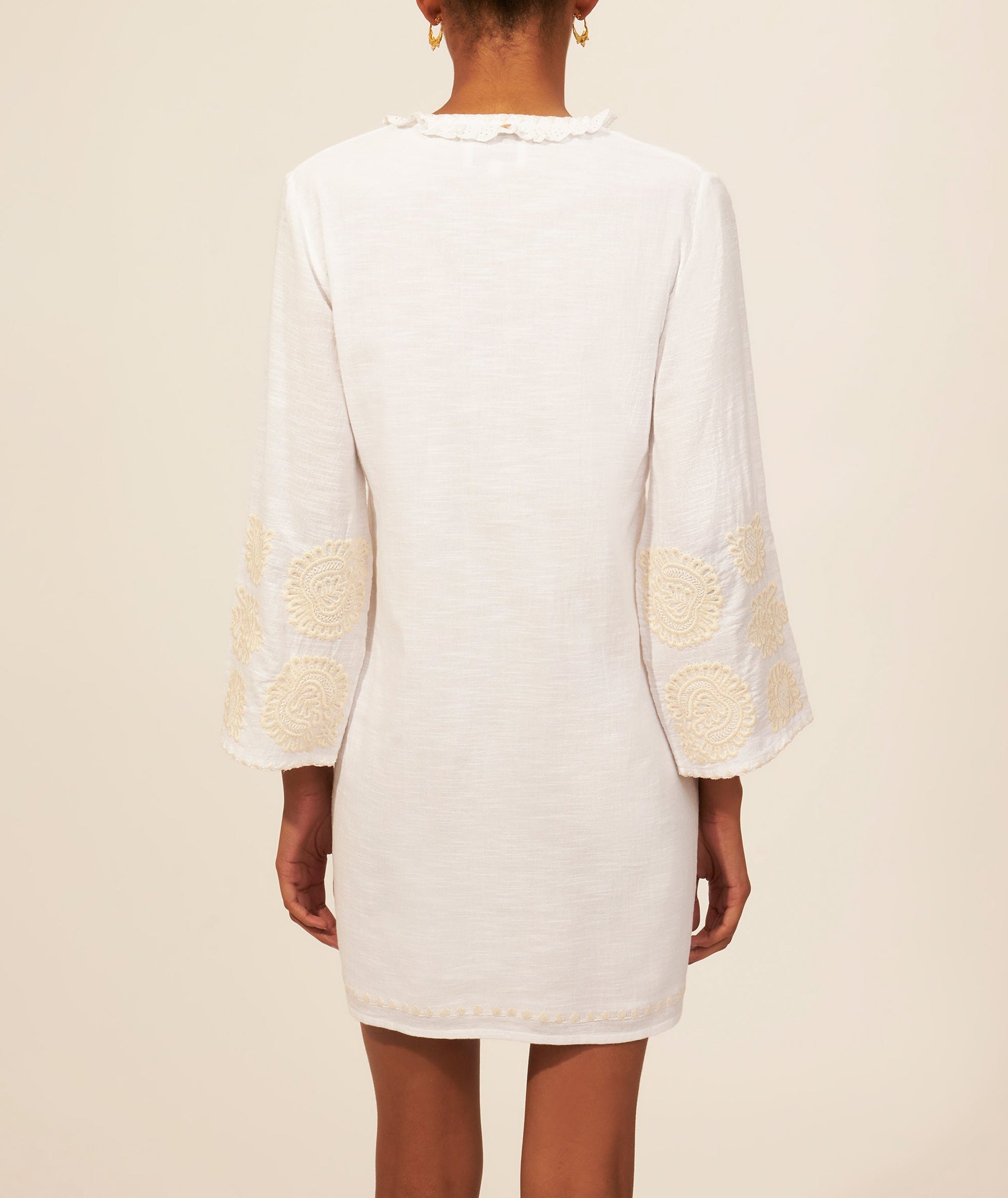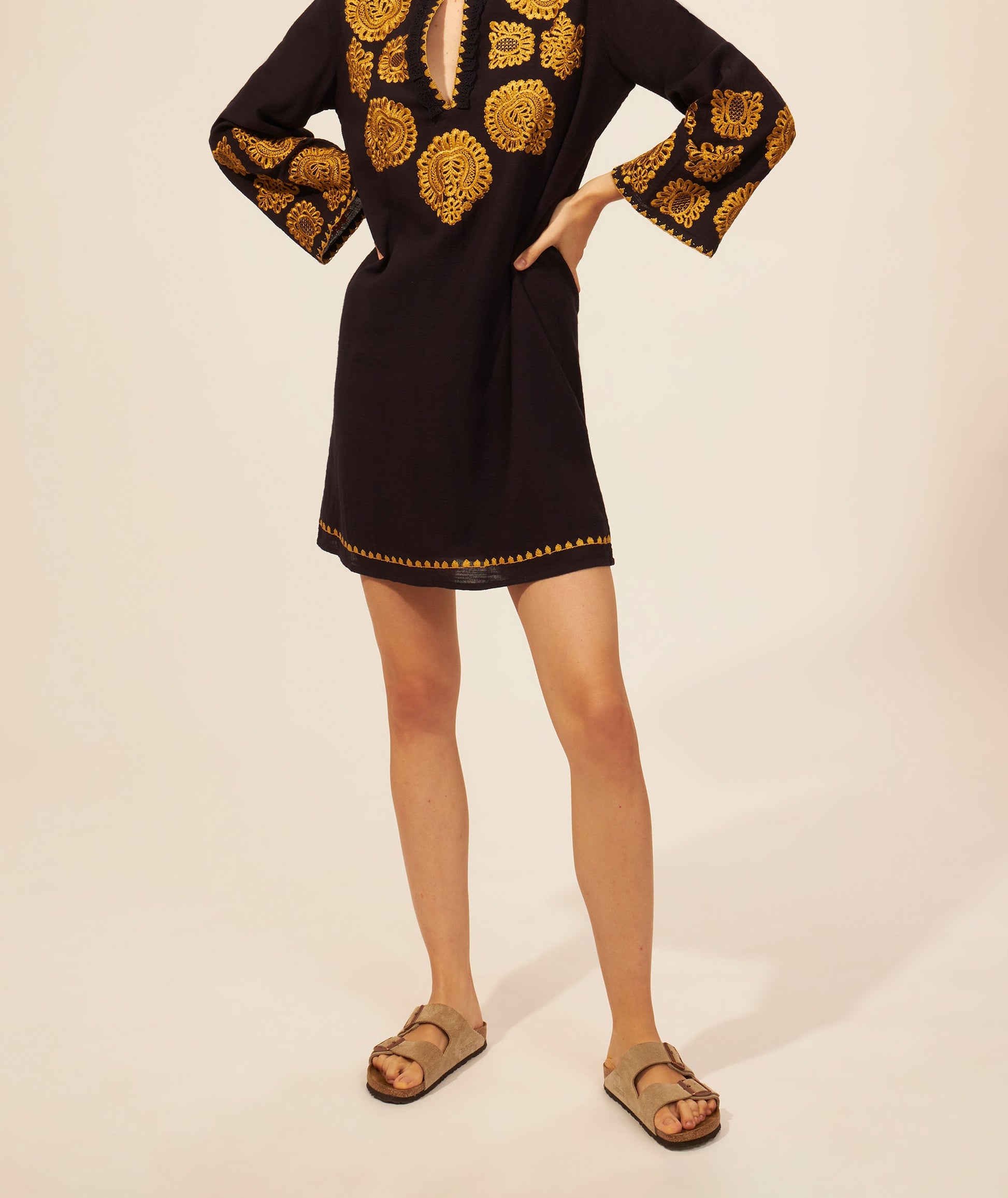 Robe courte bleu marine tissée de manière artisanale en fils de coton. Broderies moutarde et perles de rocaille inspirées du folklore hongrois.