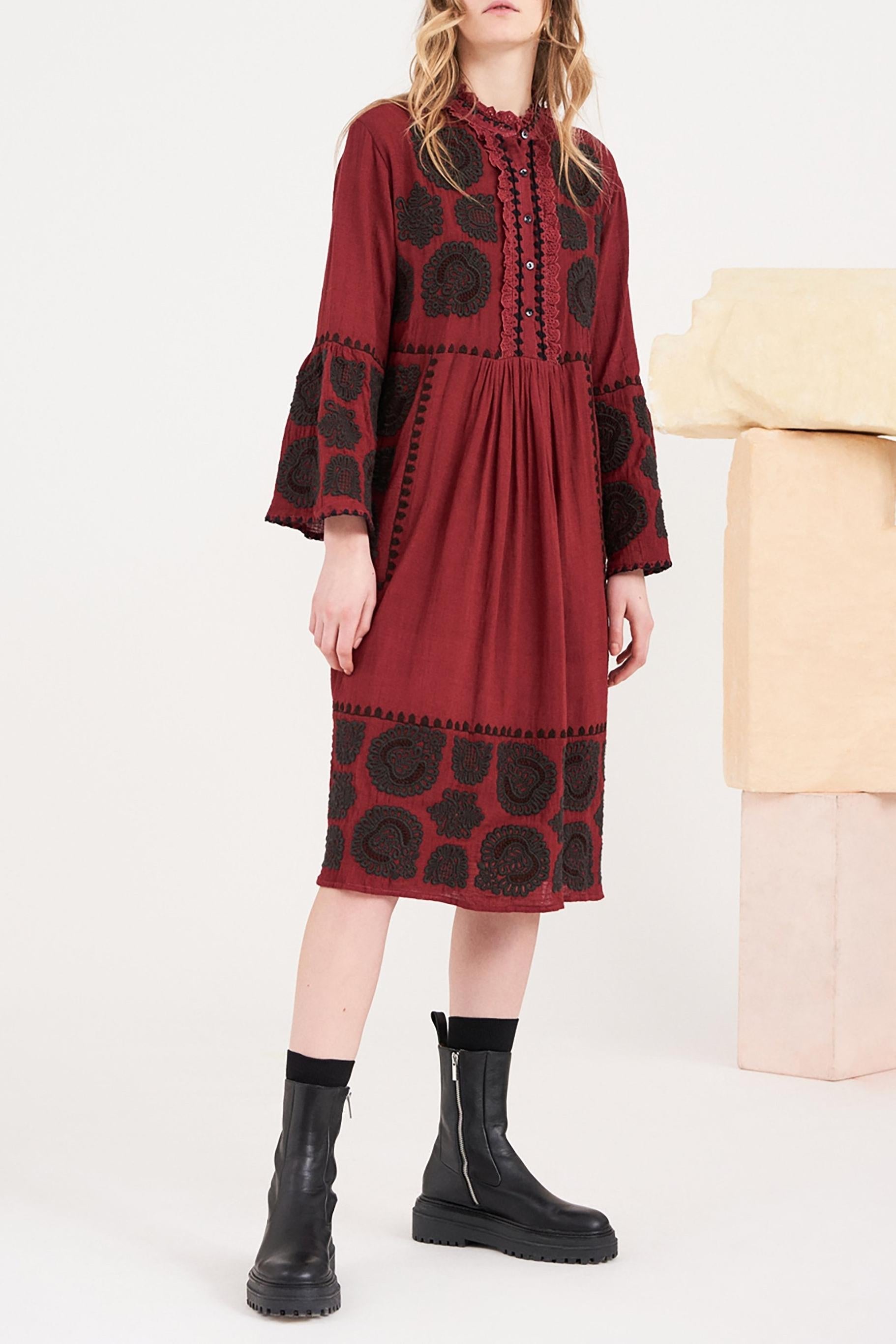 Burgundy textured cotton midi dress. Flared cut. All-over floral embroideries in black. Round neck with buttons. Ruffled collar and button placket. Gathered waist. Long bell sleeves. This iconic Antik Batik piece displays the unique savoir-faire of our embroidery artisans. Also available in cream, navy blue and khaki.