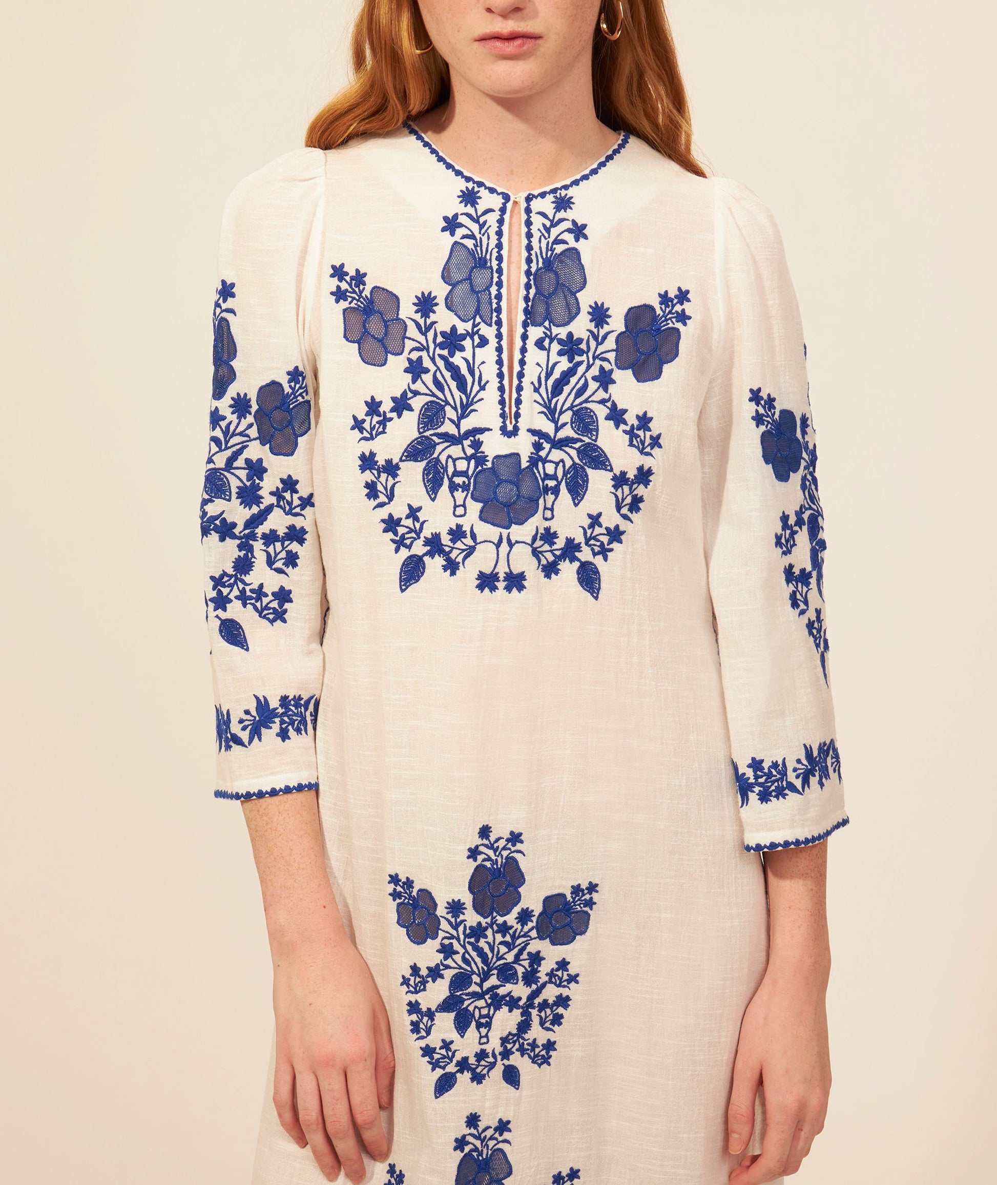 Robe longue blanche en crêpe de coton avec broderies florales bleues. La robe brodée must have pour un sans-faute estival.