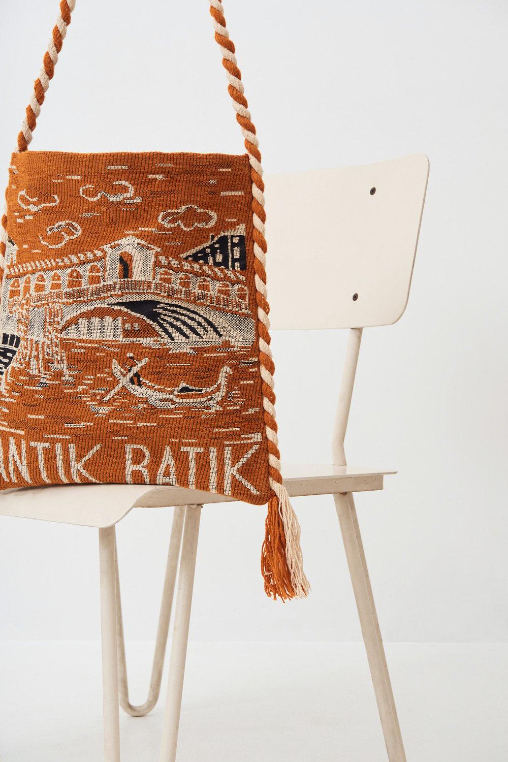 Orange cotton shoulder bag. Venetian landscape woven in cream-coloured cotton. Cotton lining. Magnetic clip closure. Zippered inside pouch. Braided details on the sides and two pompoms on the ends.