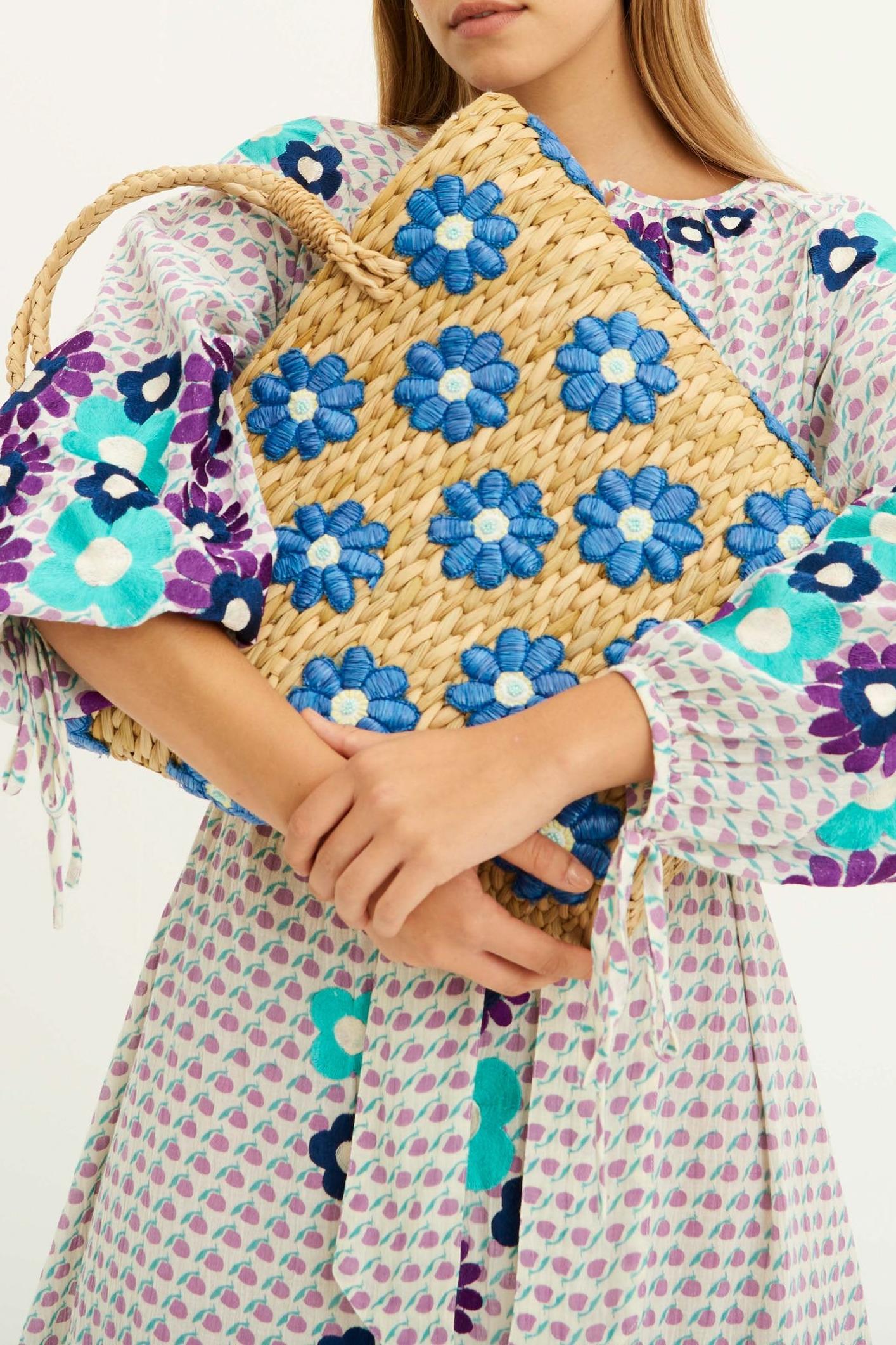 Large braided straw tote bag Floral patterns in blue, cream and pearlescent embroidery. Tone-on-tone shoulder strap. Lining and two small inner pockets in blue and white striped cotton. Zippered closure. A generous tote with detailed finishes. 100% straw