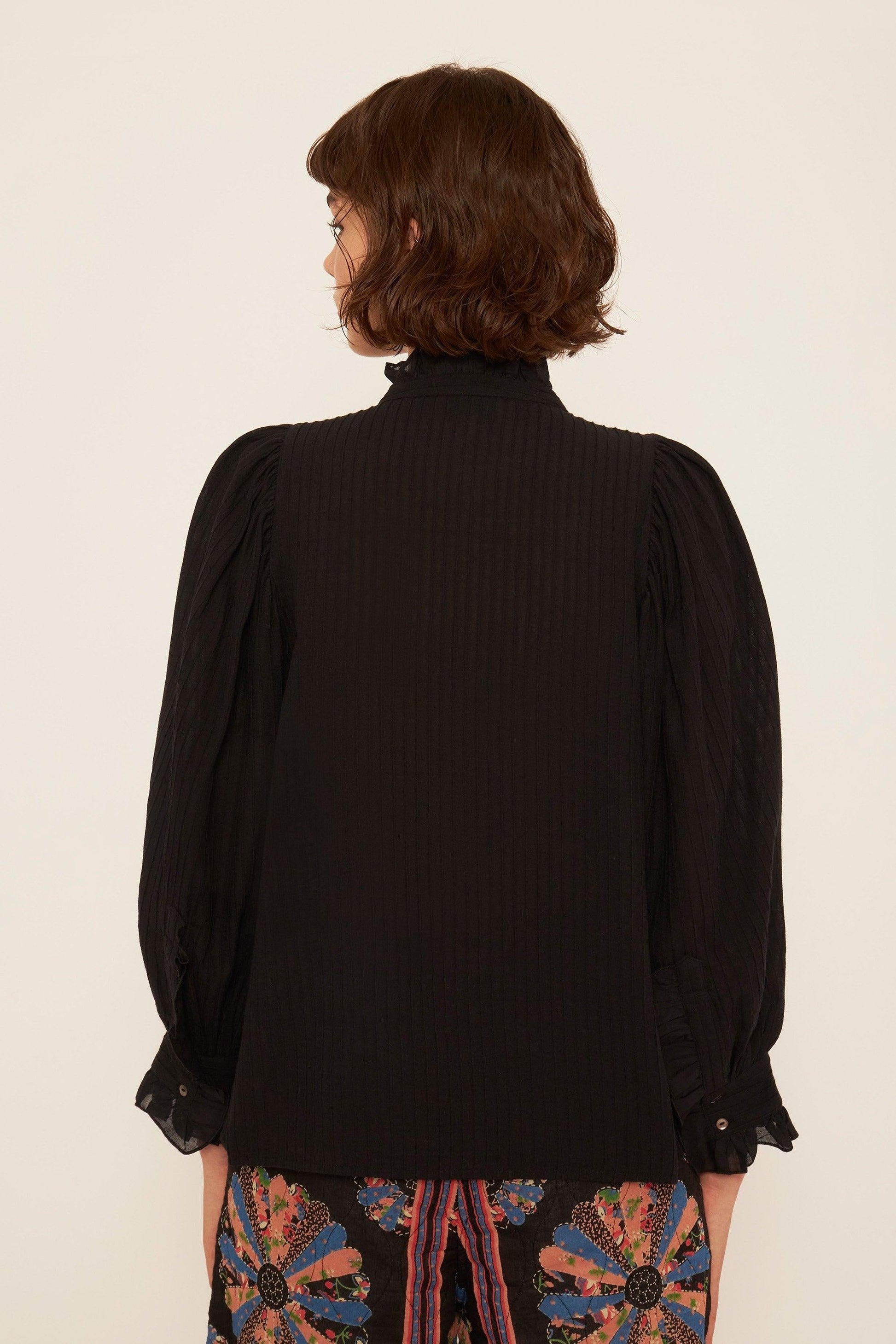 Blouse in black cotton crepe. Ribbed-effect topstitching. Puff sleeves. Ruffled collar, sleeves and button tab. Button tab with natural mother of pearl buttons.