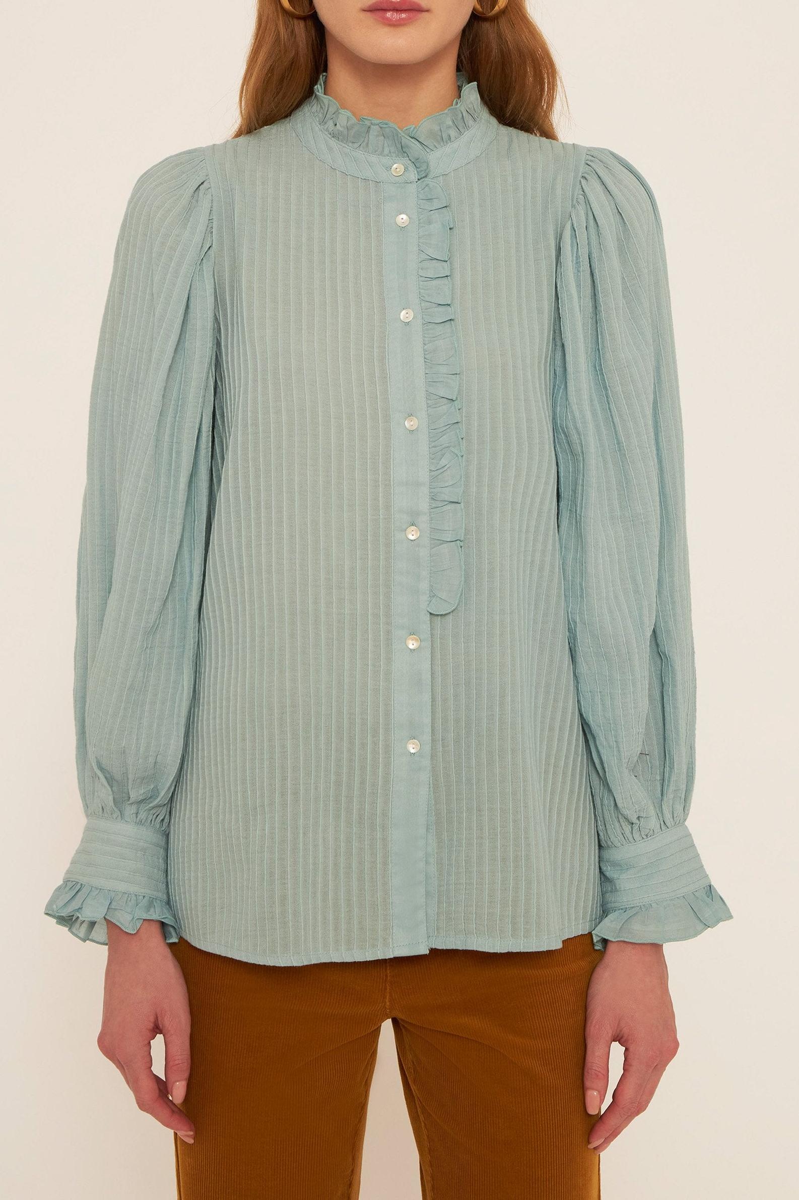 Blouse in blue and grey cotton crepe. Ribbed-effect topstitching. Puff sleeves. Ruffled collar, sleeves and button tab. Button tab with natural mother of pearl buttons.