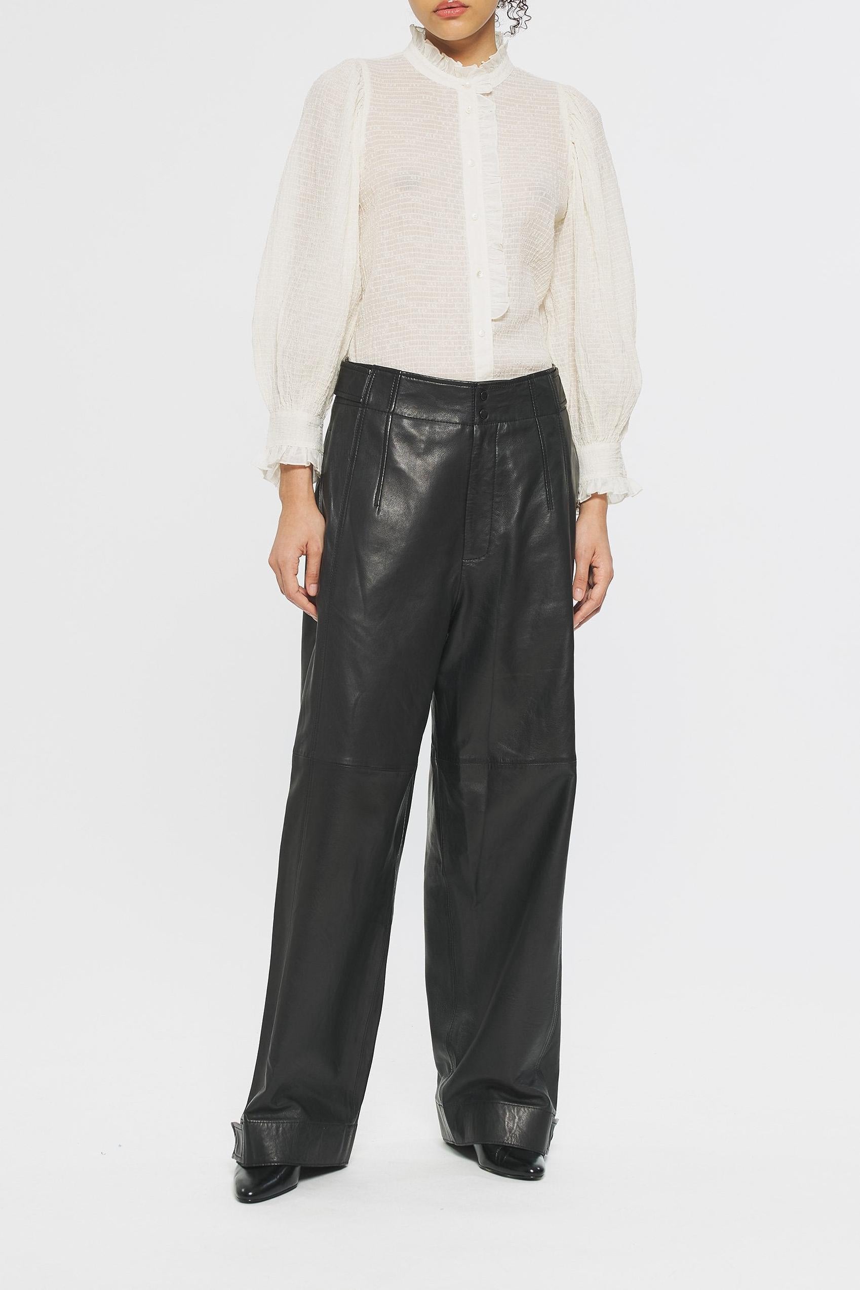 Plumeti cotton crepe blouse. Button tab on the front of blouse. Natural mother-of-pearl buttons. Balloon sleeves that come in at the wrist with elastic. Ruffled collar and sleeve cuffs.