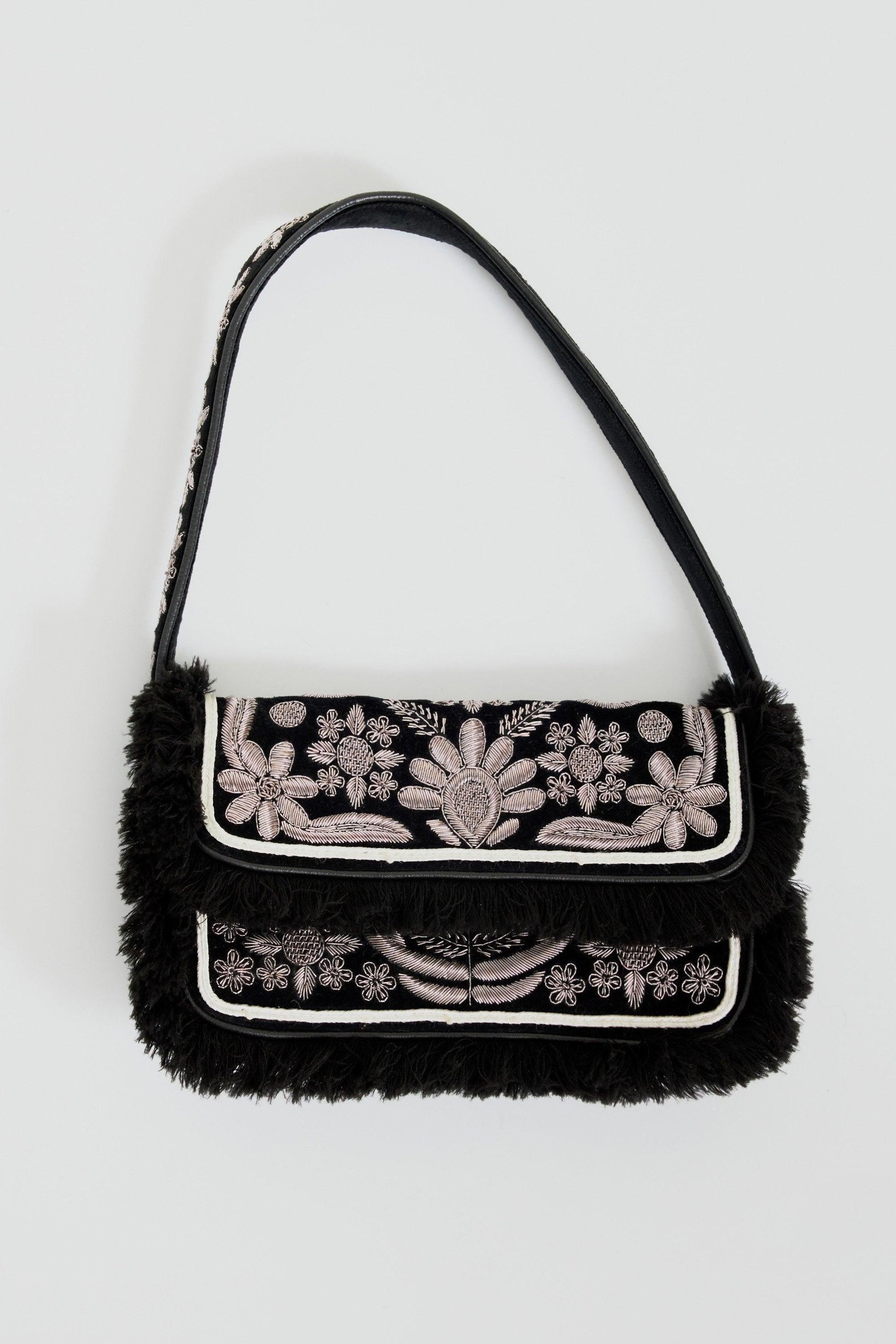Embroidered velvet cotton baguette bag. Flapped press-stud fastening. Silver hand-applied embroidery on the front and handle. Fringes at the ends. Zipped interior pocket. Lined.