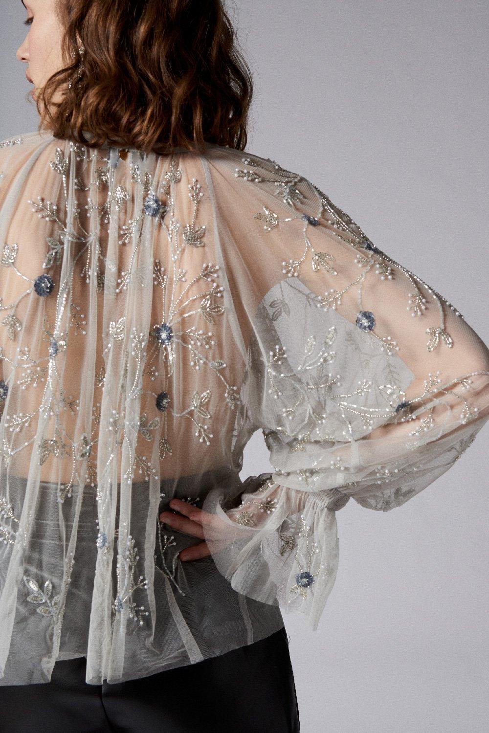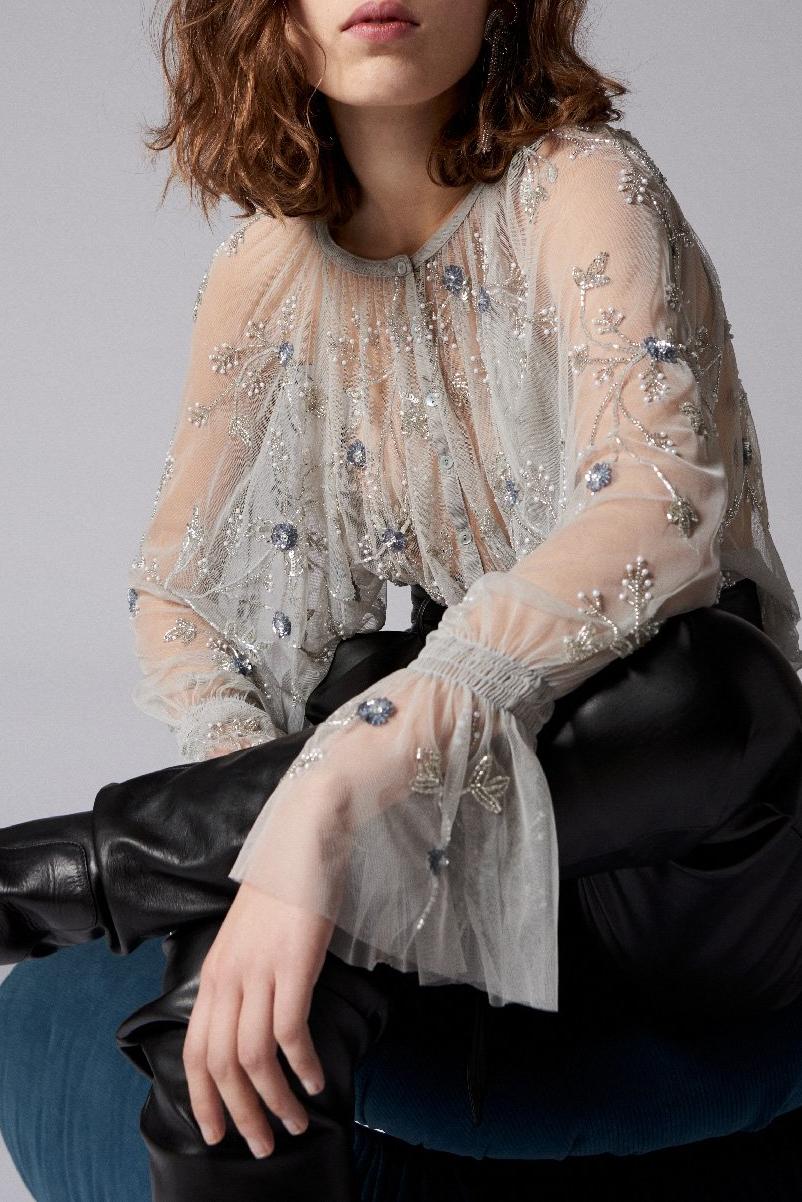 Blouse transparente brodée de motifs floraux en perles et sequins. Manches longues cloches. Col rond. Patte de boutonnage à boutons nacrés. Délicate et romantique, cette blouse dévoile subtilement la silhouette.100% Polyester