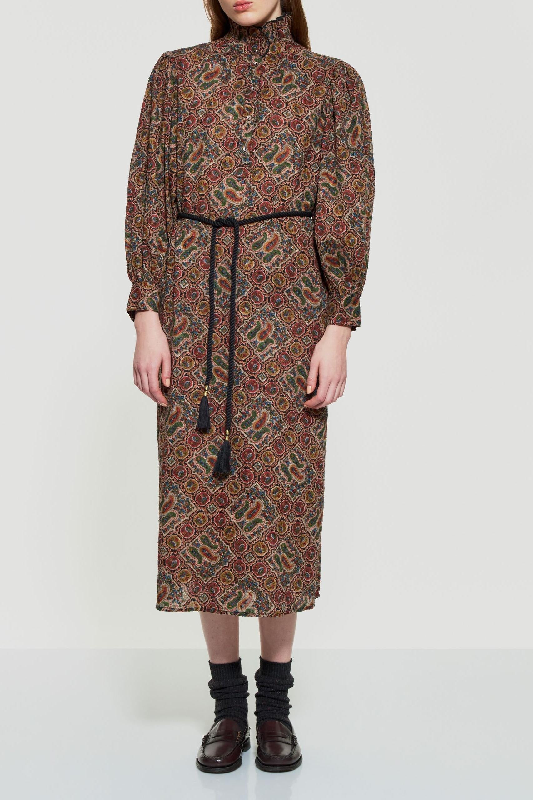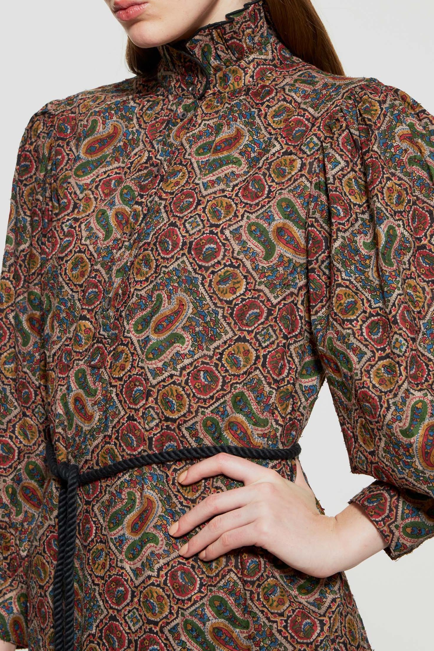 Cotton jacquard maxi dress. Print designed in our Parisian studio and then hand-applied onto the fabric using a block printing technique (Indian artisan technique). Gathered at the shoulders. Long sleeves fastened at the wrists with buttons. Ruffled collar. Button tab on the front. Removable twisted belt. Dare to go sheer - or not - thanks to the slip dress which comes with the piece. Natural mother of pearl button.